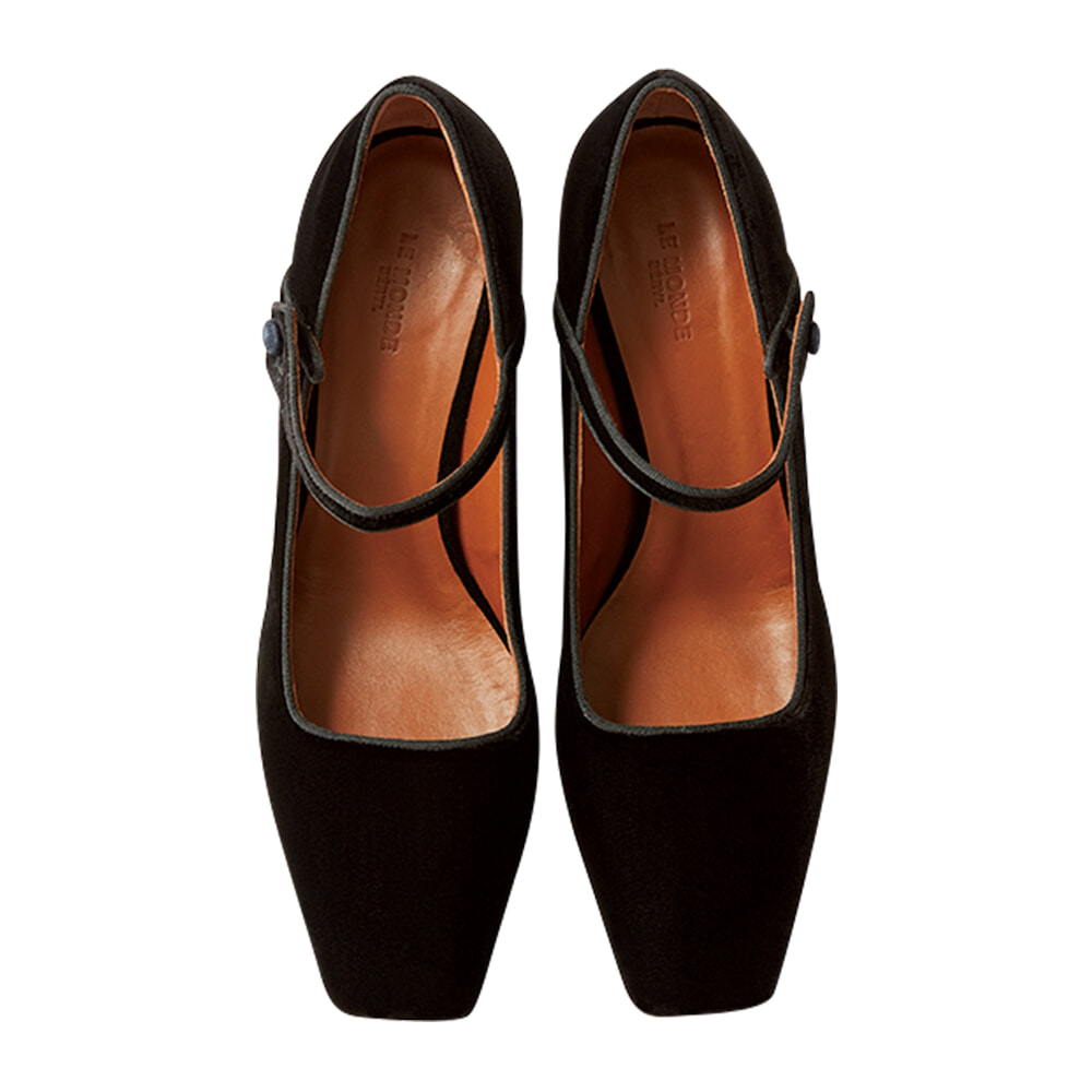 ヴェネチアのゴンドラシューズの伝統を受け継ぐものづくりで定評のブランド。シックなベルベット素材とスクエアトウで甘さを抑えて。