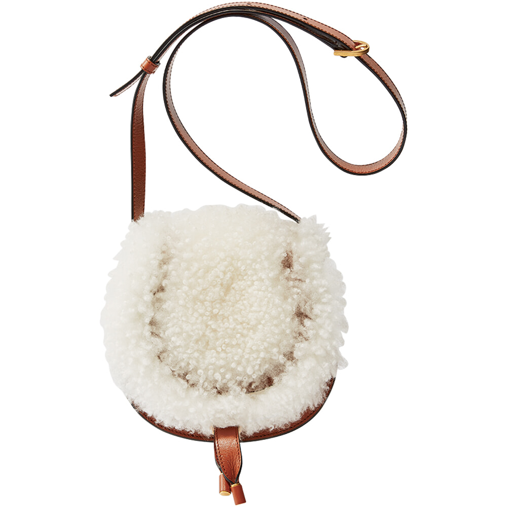 70年代のフォークスピリットから着想したサドルバッグのデザインと、ふわふわのピュアホワイトのシアリングがマッチ。