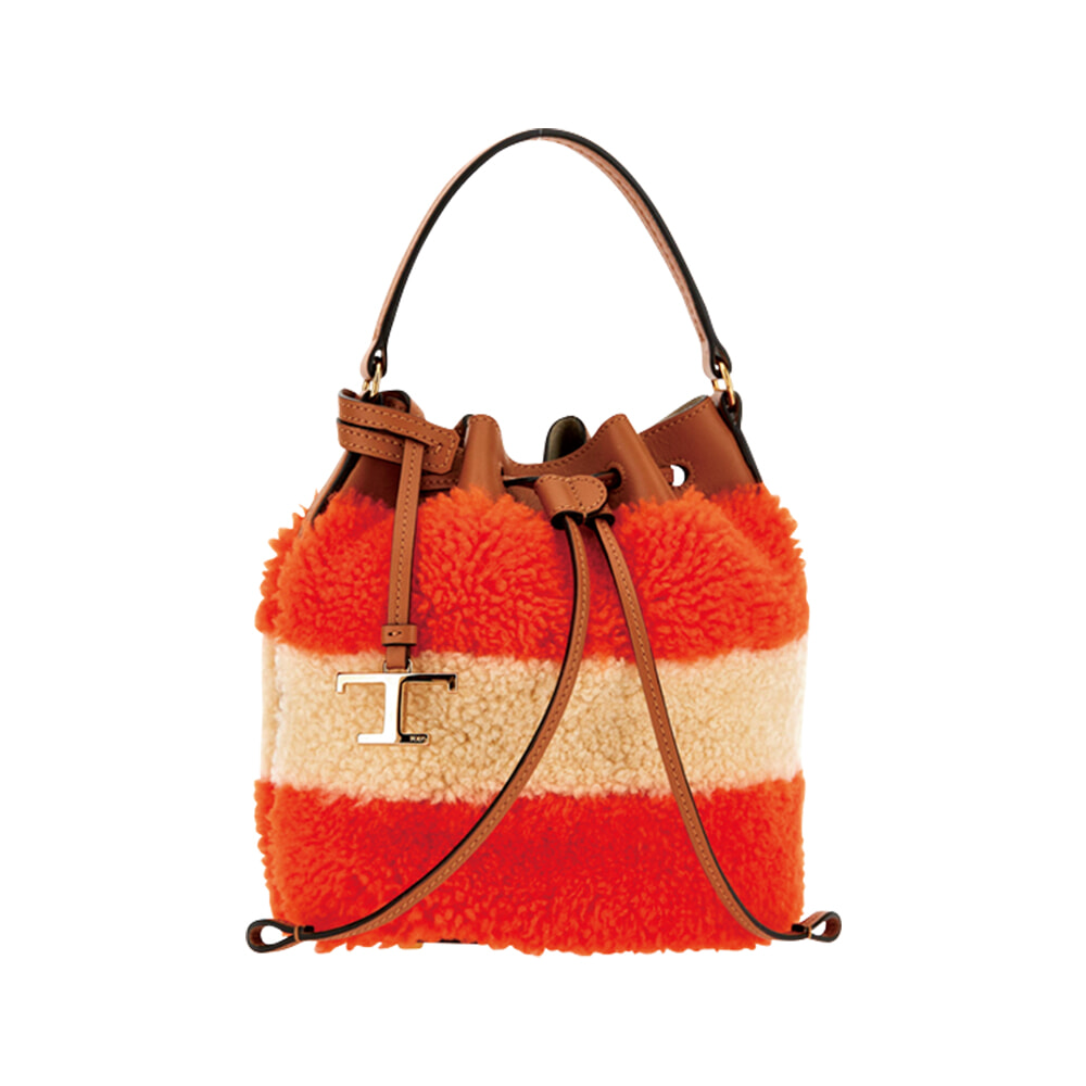メイド・イン・イタリーの粋を感じさせるカーフの巾着型バッグに、シアリングで表現されたビビッドなボーダー模様が鮮やかに映える。