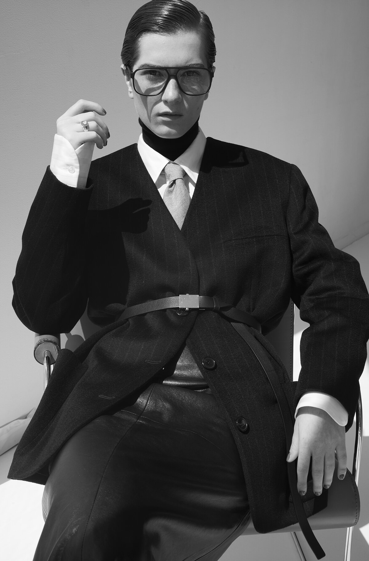 ジャケット¥910,800、ニット¥339,900、ベルト¥154,000/以上ザ・ロウ(ザ・ロウ・ジャパン) シャツ¥50,600/ブーリエンヌ(エスケーパーズオンライン) スカート¥148,500/コーチ(コーチ・カスタマーサービス・ジャパン) ネクタイ¥19,800/AD&C 1956 MILANO(伊勢丹新宿店) メガネ¥81,400/マイキータ(マイキータ ジャパン) リング¥47,000/トムウッド(トムウッド プロジェクト)