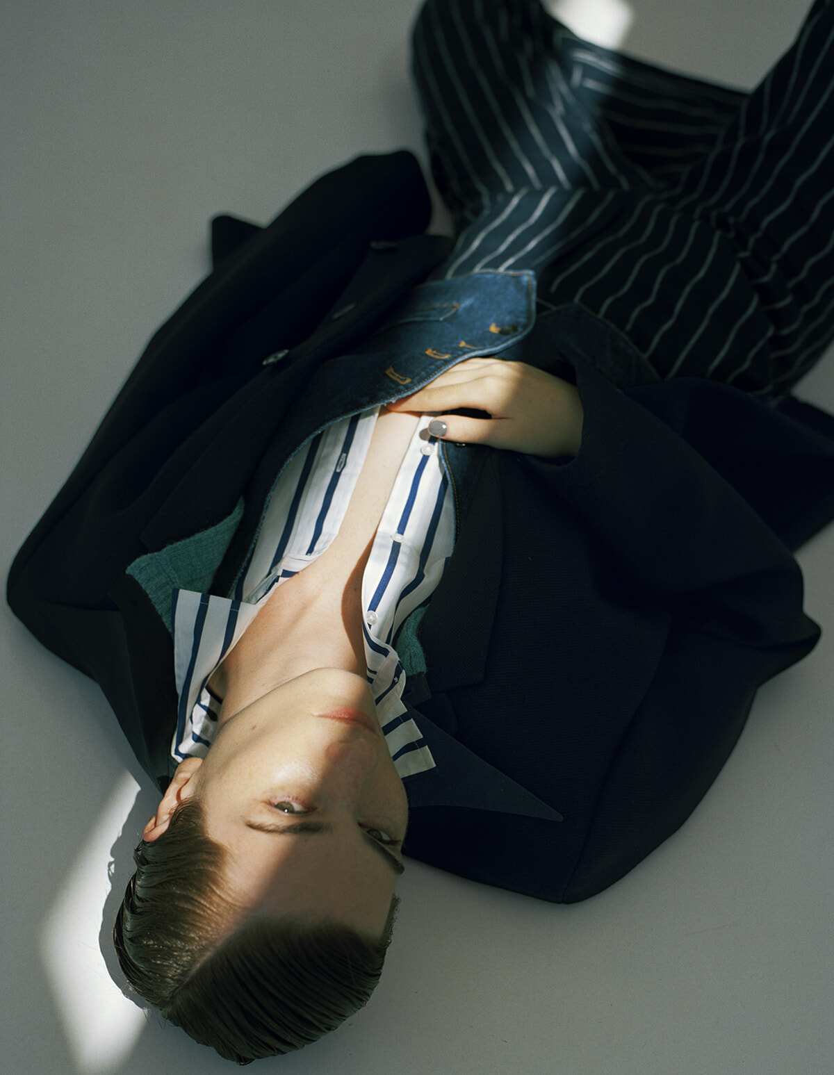 デフォルメされたピークトラペルがモダンなムードを醸すジャケットは、たっぷりとしたオーバーサイズを楽しみたい。胸元を大きく開けて着たストライプのシャツに、ボトムスはその色を反転させたようなピンストライプのパンツ、デニムのベストがサプライズをもたらしてくれる。