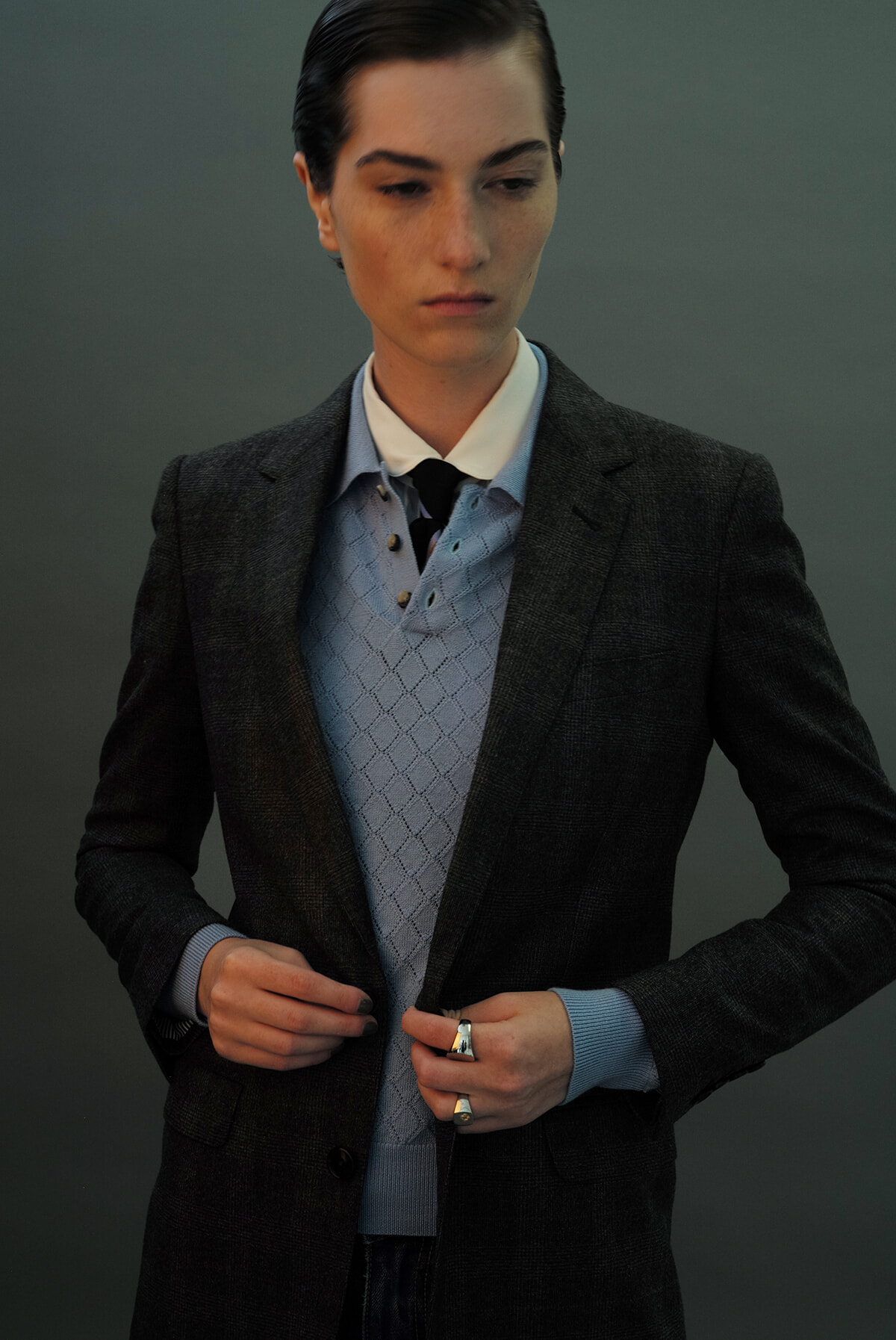 ジャケット¥412,500、シャツ¥187,000、パンツ¥132,000(すべて予定価格)/以上セリーヌ バイ エディ・スリマン(セリーヌ ジャパン) ニット¥18,700/スティーブン アラン(スティーブン アラン シンジュク) ネクタイ¥15,400/ダイリク 人指し指リング¥64,400、薬指リング¥47,000/ともにトムウッド(トムウッド プロジェクト)