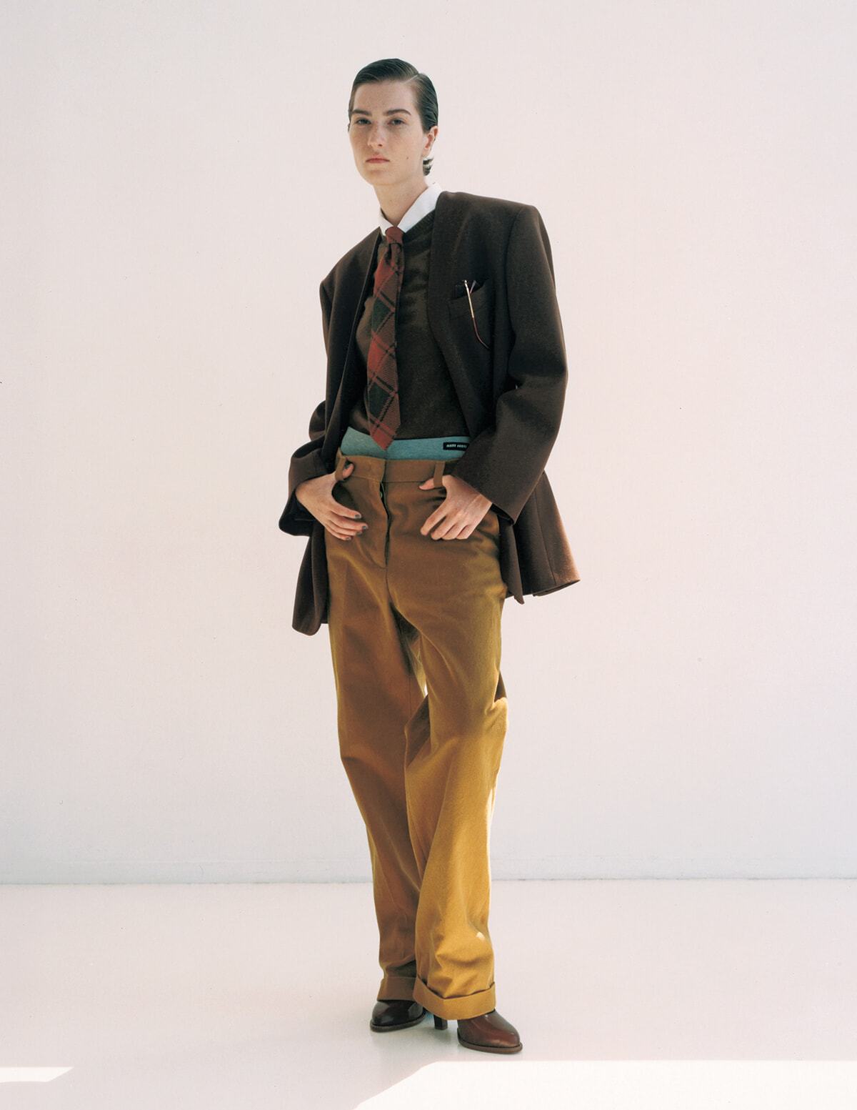 ジャケット¥256,300、シューズ¥160,600/ともにトッズ(トッズ・ジャパン) ニット¥192,500、パンツ¥165,000、レギンス¥133,100(すべて予定価格)/以上ミュウミュウ(ミュウミュウ クライアントサービス) シャツ¥49,500/トゥモローランド ビー(トゥモローランド 渋谷本店) ネクタイ¥23,100/マーガレット・ハウエル メガネ¥70,400/マイキータ(マイキータ ジャパン)