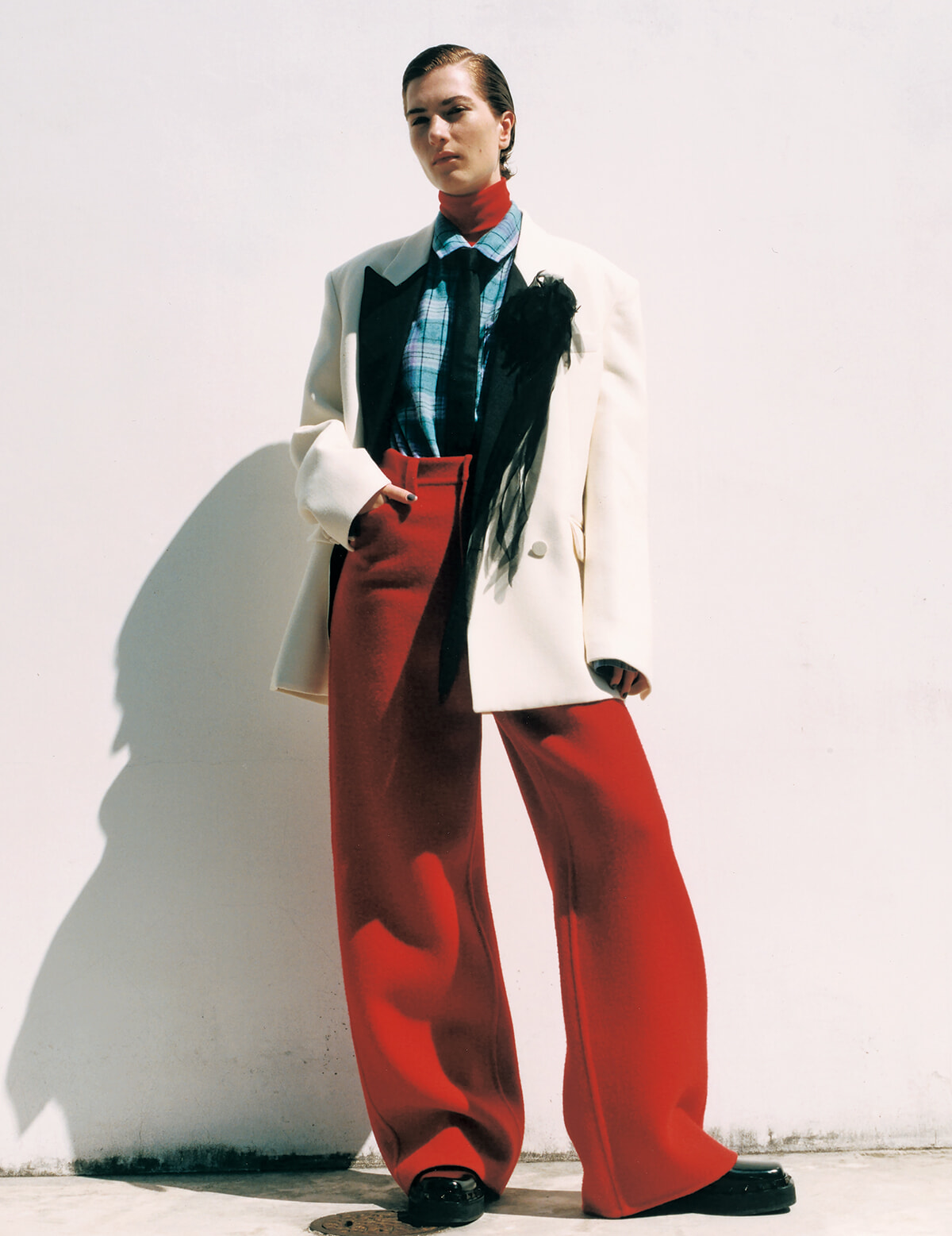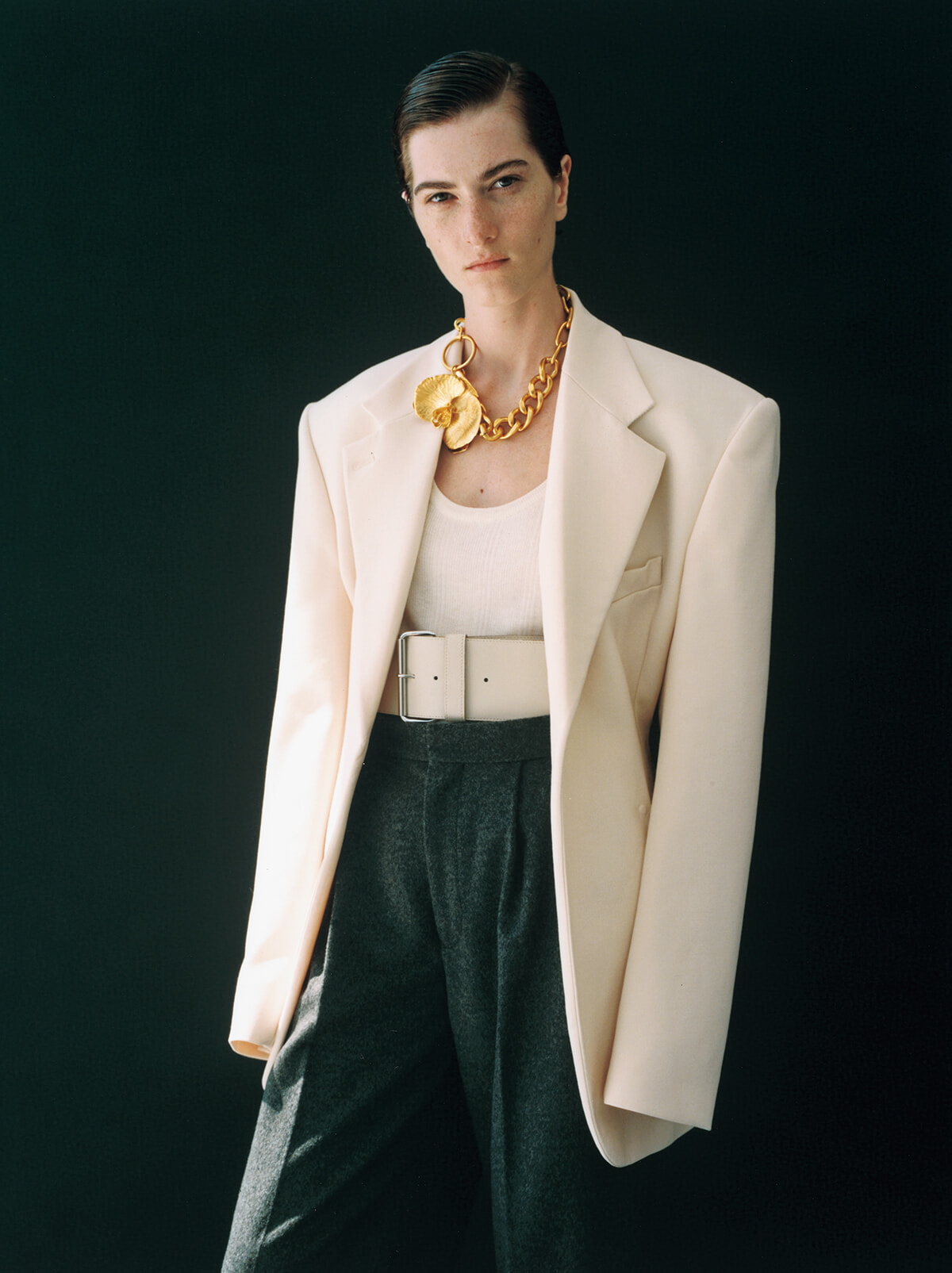 スクエアショルダーの凜としたフォルムを生かしたシンプルな着こなし。大きな花のチョーカー、パンツのウエスト位置からずらしたワイドなベルトが、スタイリングにリズムを与える。