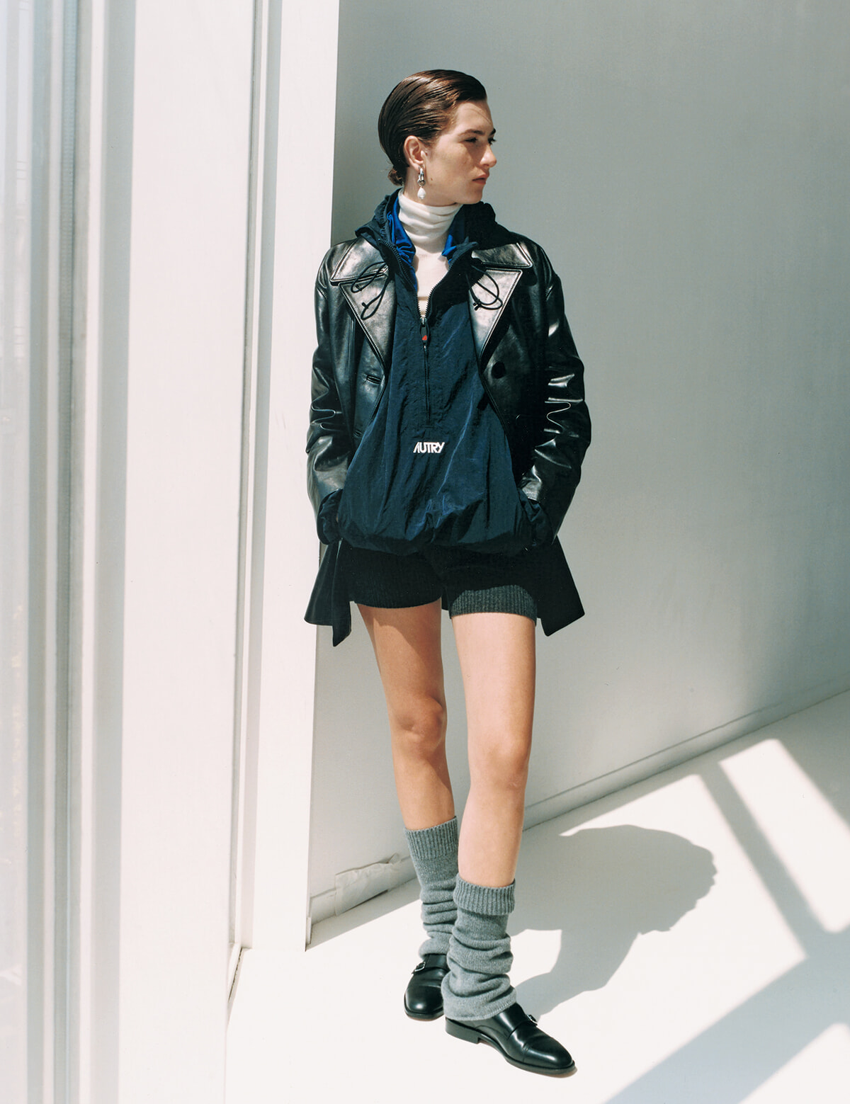 ナイロンのブルゾンにマイクロミニサイズのショーツ、モンクストラップシューズに合わせたレッグウォーマー。シングルブレストのクールなレザージャケットは、遊び心たっぷりに纏いたい。