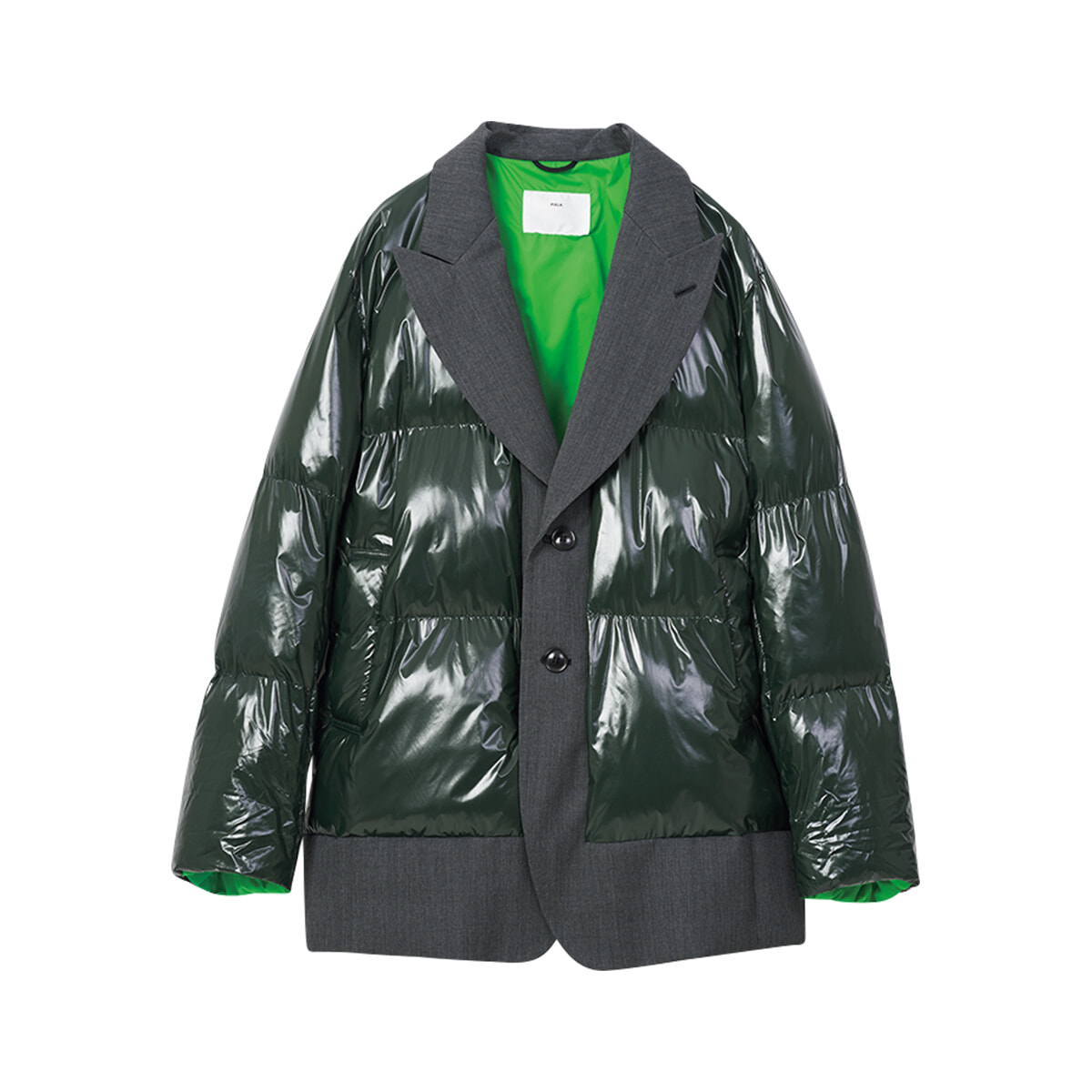 テーラードにパフ素材が加わったハイブリッドな一着。袖をまくりグリーンの裏地を見せるのも◎。¥132,000/トーガ プルラ(トーガ 原宿店)