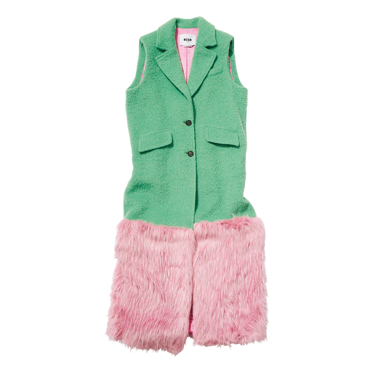 気ままに移ろう夢の中の世界を多彩なカラーパレットで表現したコレクションから、毛足の長いピンクのフェイクファーが裾にあしらわれたジレコートが登場した。ドレスとして一枚で着用しても素敵。¥199,100(予定価格)/エム エスジーエム(アオイ)