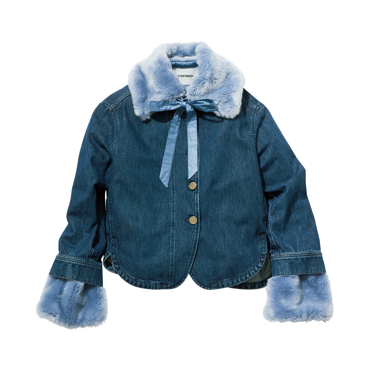 デニムにボリュームファー、ショート丈が好バランスなブルゾンは、付け襟にリボンがあしらわれ、フェミニンな印象。インナーのリバーシブルのファージャケットは単品使いもできて大活躍するはず。¥173,800/エンポリオ アルマーニ (ジョルジオ アルマーニ ジャパン)