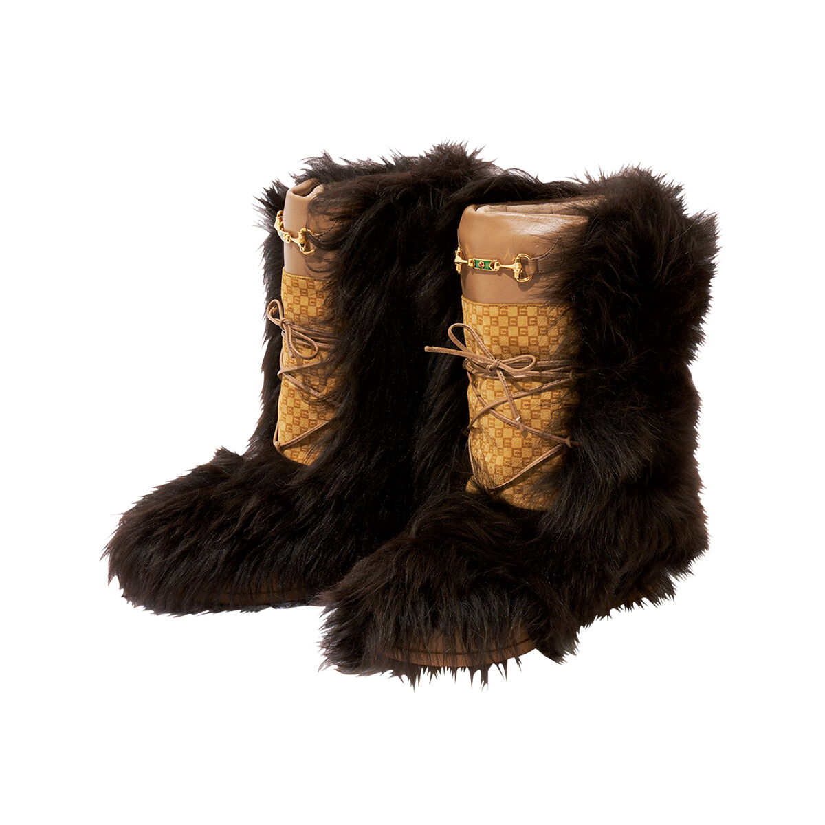 モコモコのファートリムが愛らしいスノーブーツがお目見え。全面スクエアGモチーフのスエードにあしらわれたゴールドのホースビットが、リュクスな印象を添える。ミニスカートと合わせたい。(ヒール1.5cm)¥280,500/グッチ(グッチ クライアントサービス)