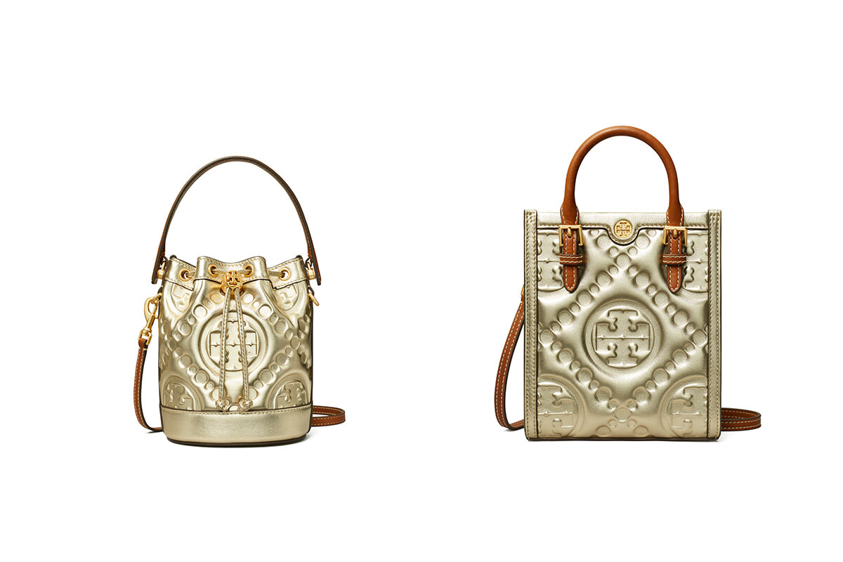 左:「Tモノグラム エンボスメタリック ミニバケットバッグ」(H18×W14×D11cm)¥77,000 右:「Tモノグラム エンボスメタリック ミニトート」(H19×W16×D5cm)¥60,500/ともにトリー バーチ(トリー バーチ ジャパン)