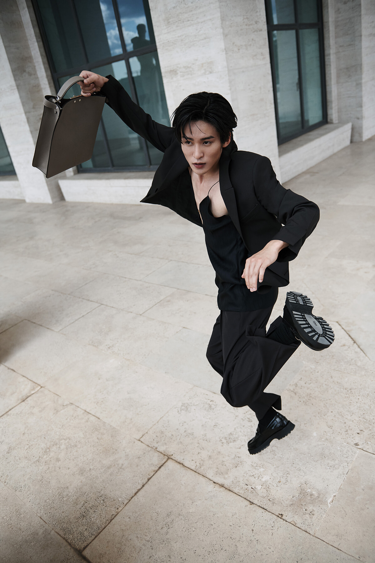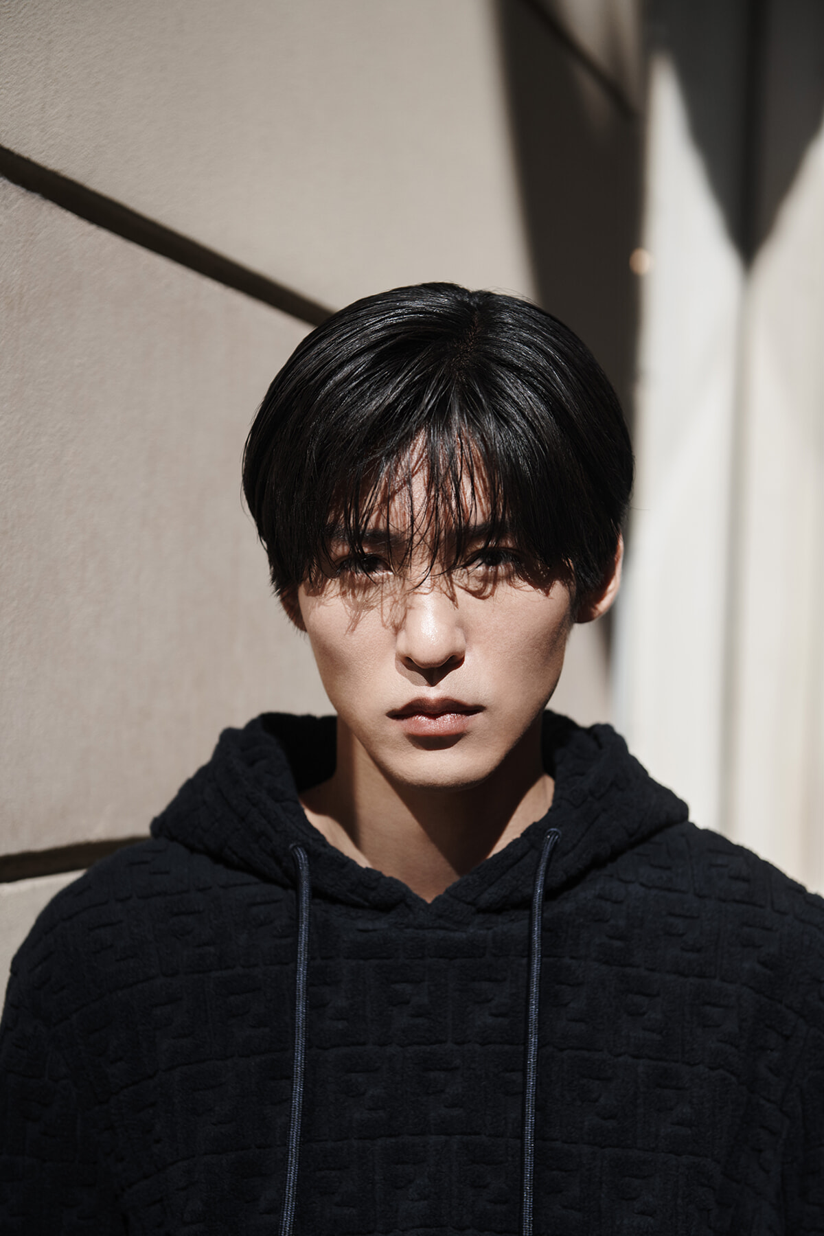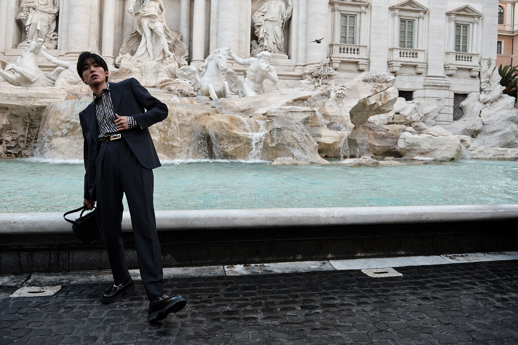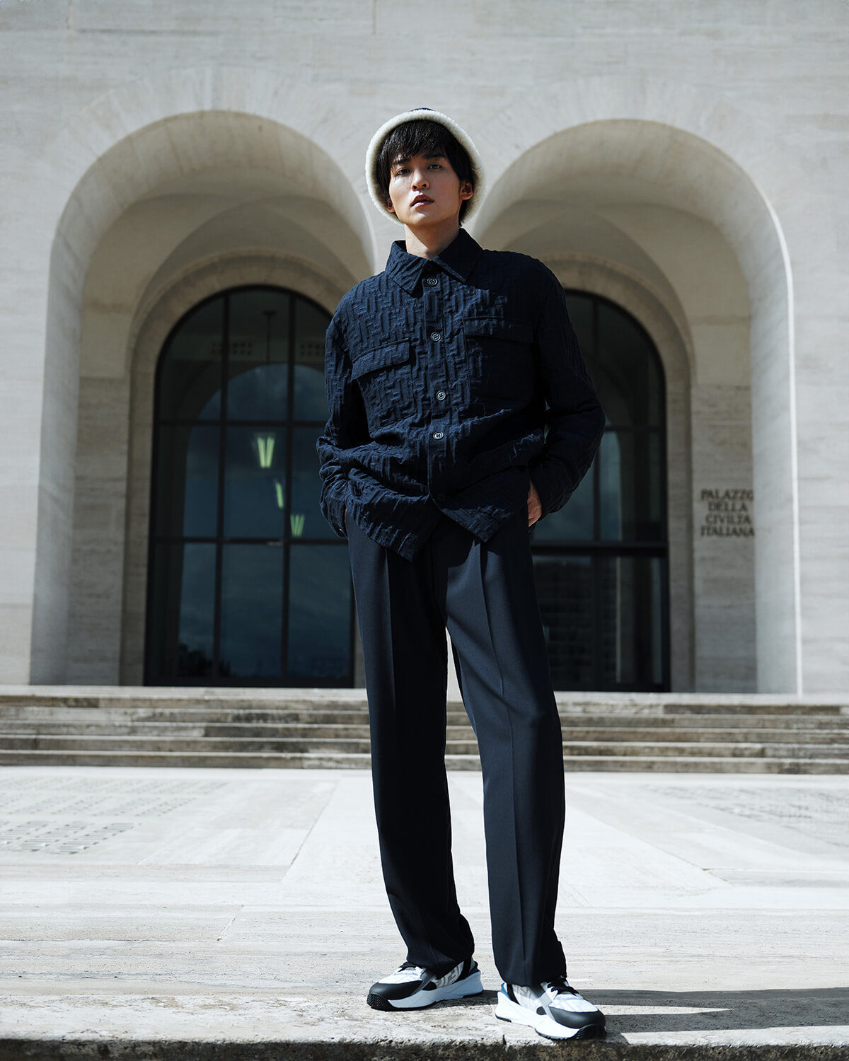 目黒蓮が纏ったのは、フェンディ2023年ウィンターコレクション。ブランドの本拠地であるイタリア・ローマを舞台に、イタリア文明宮(Palazzo della Civiltà Italiana)やトレヴィの泉(Fontana Di Trevi)、そして世界最大規模のフェンディ ローマ旗艦店「パラッツォ フェンディ(Palazzo FENDI)」といったスポットで撮影を実施。クールなジャケットスタイルからスポーティなフーディやスニーカースタイルまで、アイコンバッグ、ピーカブーとともに数々のスタイルを披露した。