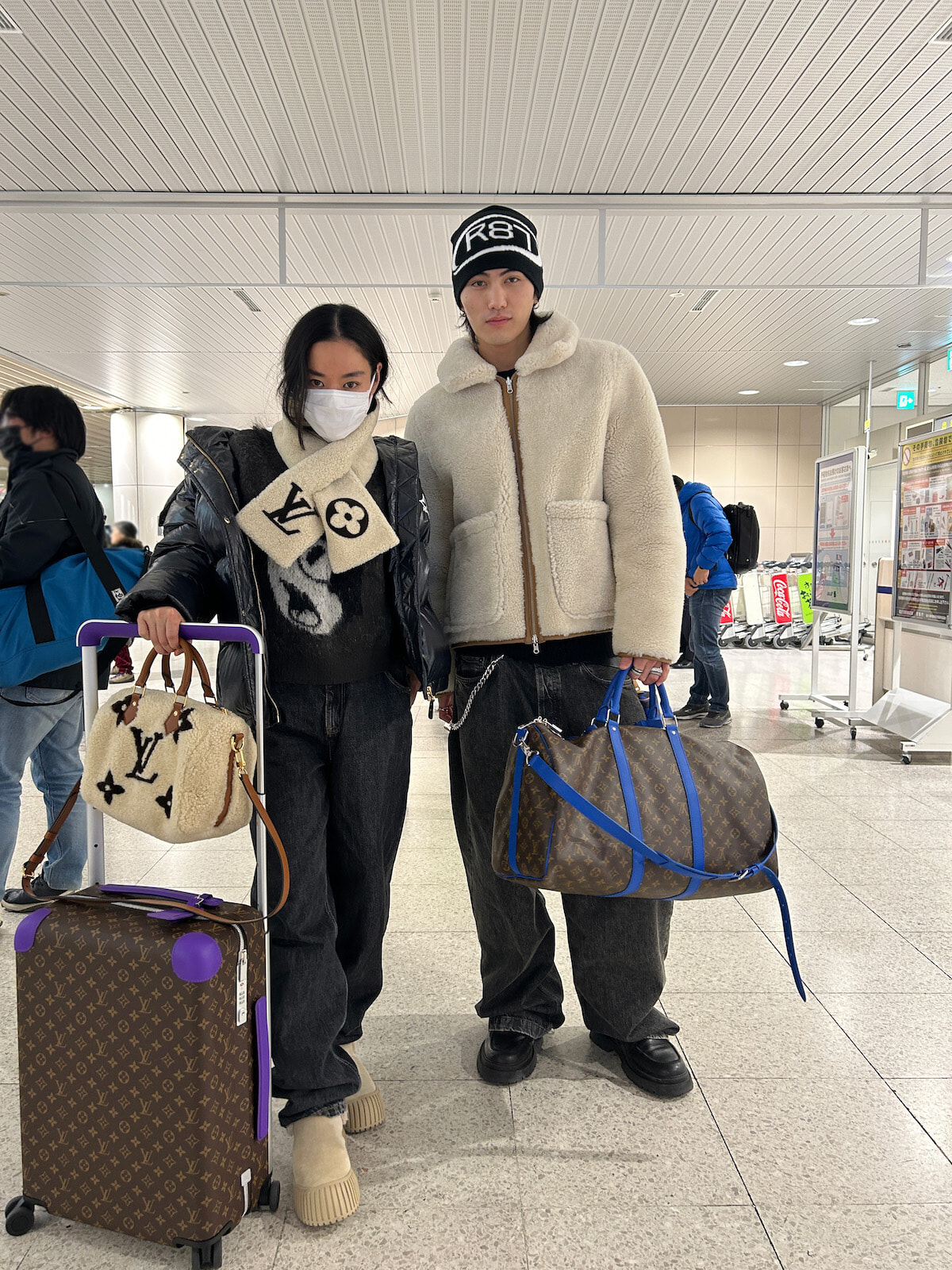 Awichは「LV SKI」コレクションのシアリングマフラーと、ハンドバッグ、「スピーディ・バンドリエール 25」をいち早く愛用。旅の移動は、色鮮やかなアクセントが特徴のキャリーバッグ「ホライゾン 55」、大平修蔵は「キーポル・バンドリエール 50」とともに。