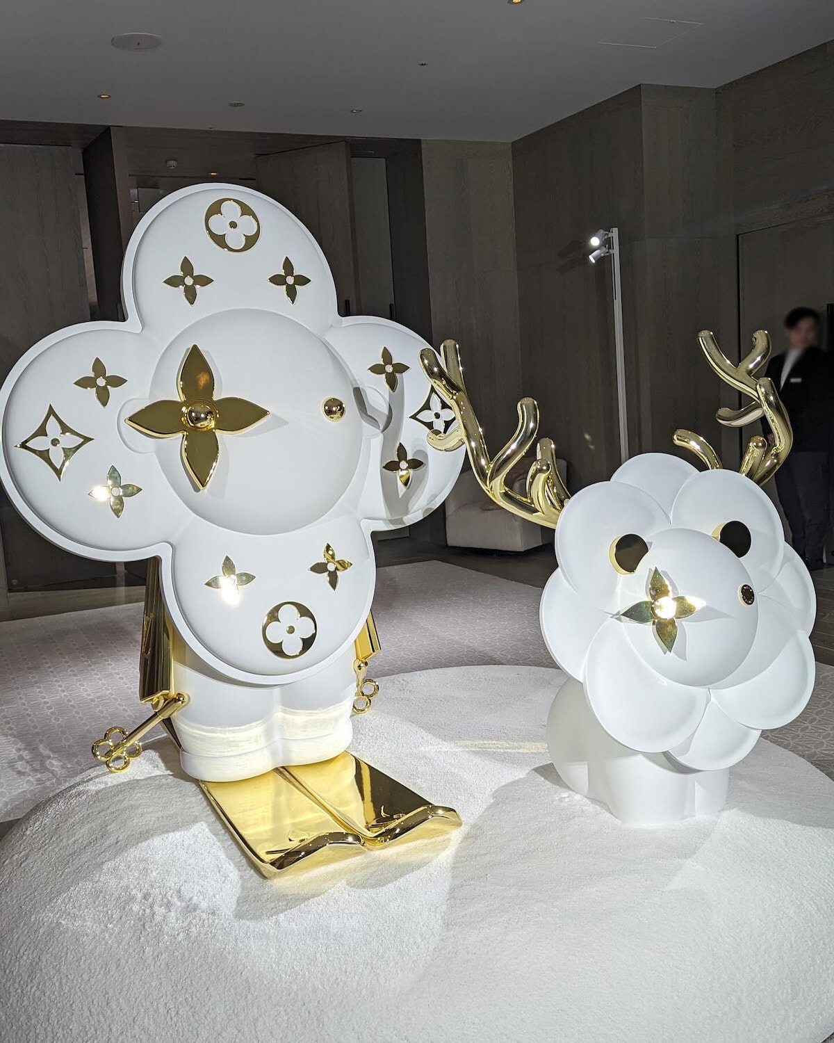 会場には、雪像のような遊び心溢れる巨大なロゴやルイ・ヴィトンのマスコット「ヴィヴィエンヌ」と「ペチュラ」のオブジェも登場。