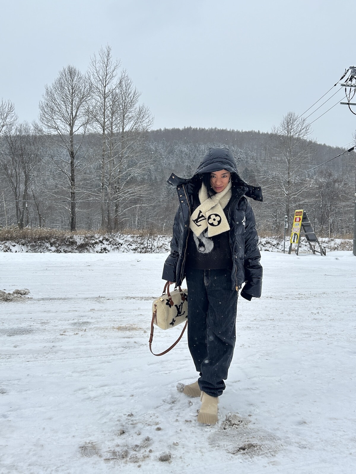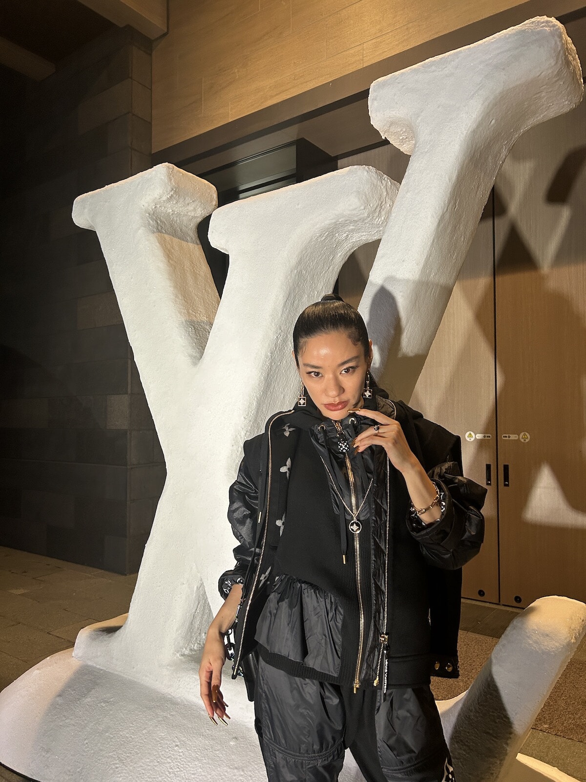「大好きなゴールドとダイヤモンドのファインジュエリーが映えるよう、「LV SKI」コレクションのウエアやバッグ、シューズもオールブラックでまとめました。「クッサンPM」バッグは、玉虫色のモノグラムと太めのチェーンに一目惚れ」