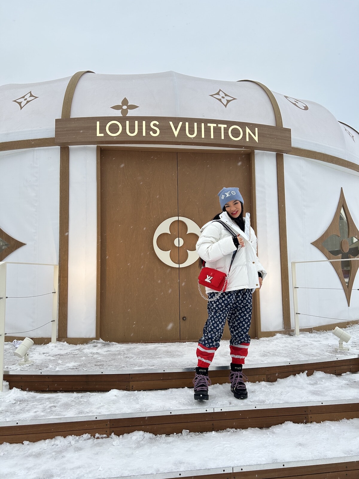 ゲレンデに登場したルイ・ヴィトンの象徴的なモチーフをあしらったユルトの前で撮影。