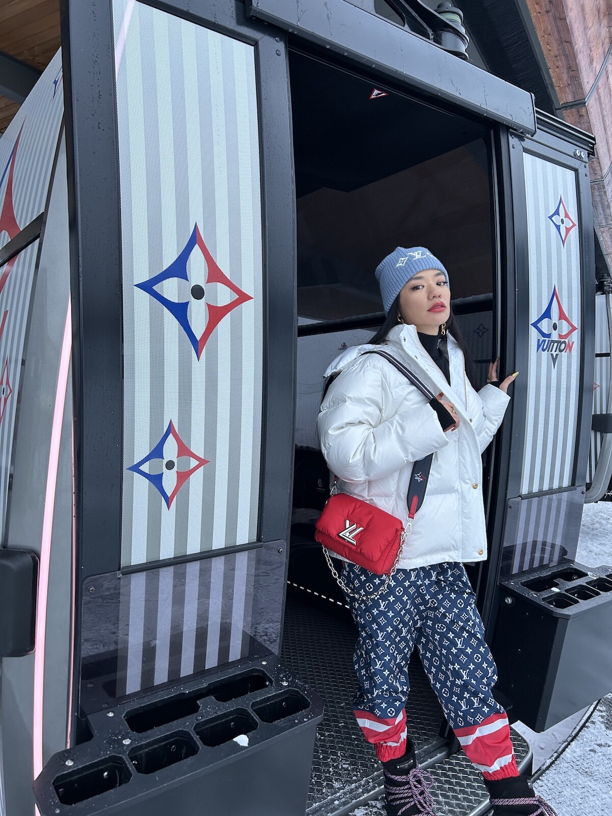 パフィーなボリューム感でありながら、軽量で防寒性も抜群なパファジャケットに、「LV SKI」コレクションを象徴するトリコロールカラーのモノグラムジョギングパンツ、アスペン・ライン アンクルブーツ、リサイクルナイロン素材の真っ赤なバッグ「ツイスト PM」を合わせ、遊び心溢れるコーディネートの完成!