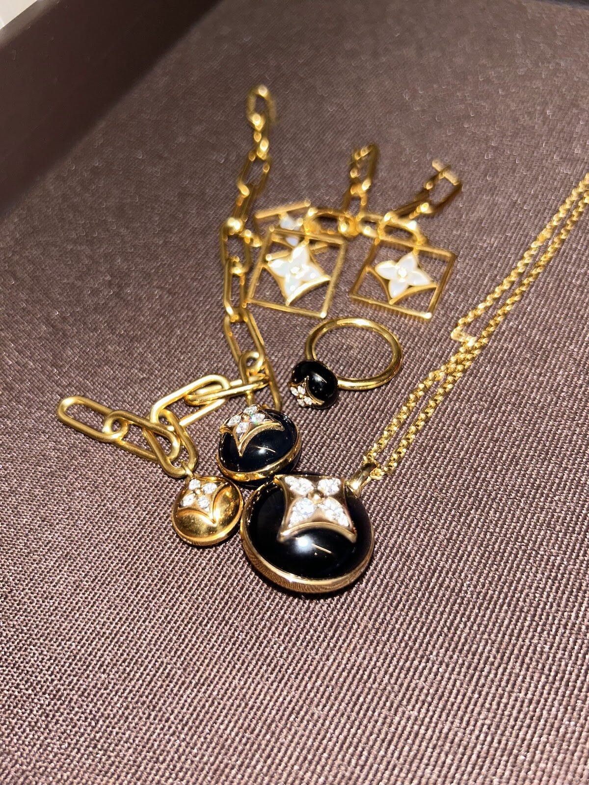 夜は「LV SKI」コレクションにファインジュエリーを合わせ、プレビューイベントに参加。「カラー ブロッサム」シリーズのイエローゴールド × オニキス × ダイヤモンドをセレクト。