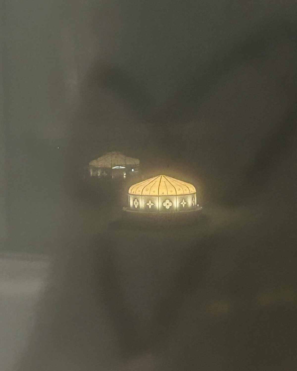 ホテルの部屋から見たライトアップされたユルト。窓ガラスに♡マークも。