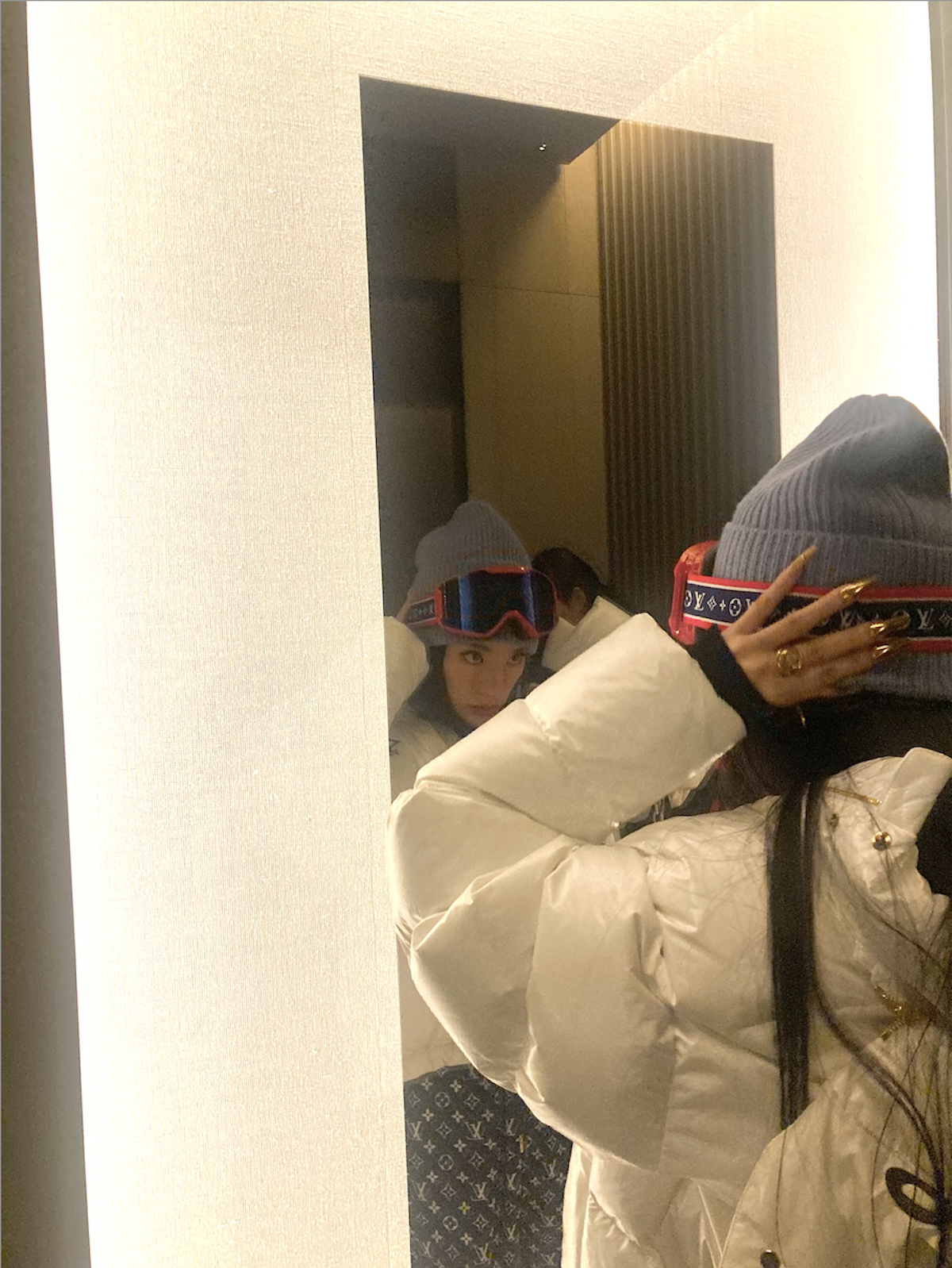 デザイン性と機能性を兼ね備えたゴーグル「LV スノー」を装着。「沖縄出身なので馴染みがあまりないのですが、スノーボードに挑戦してみたいです」と語るAwich。