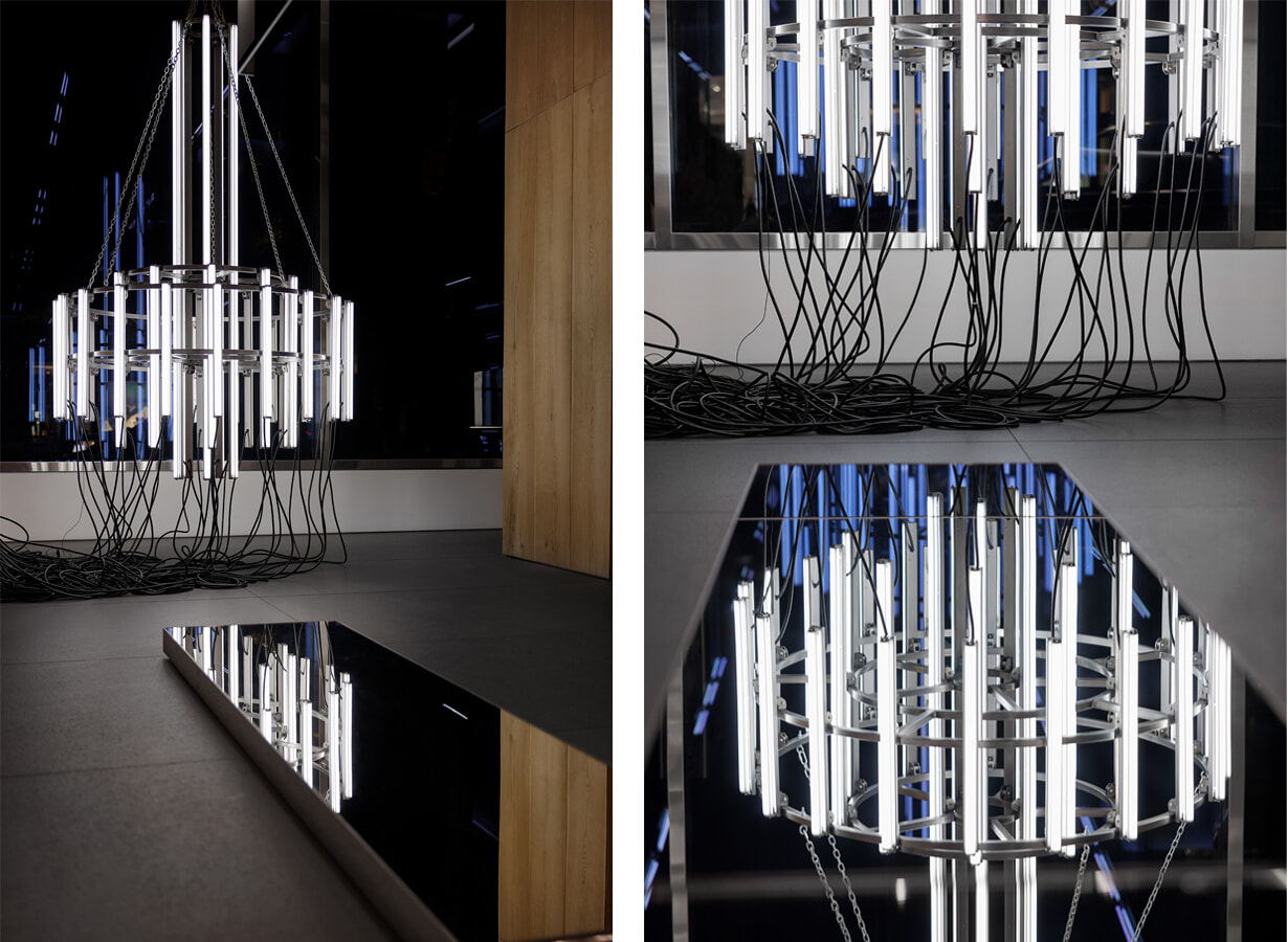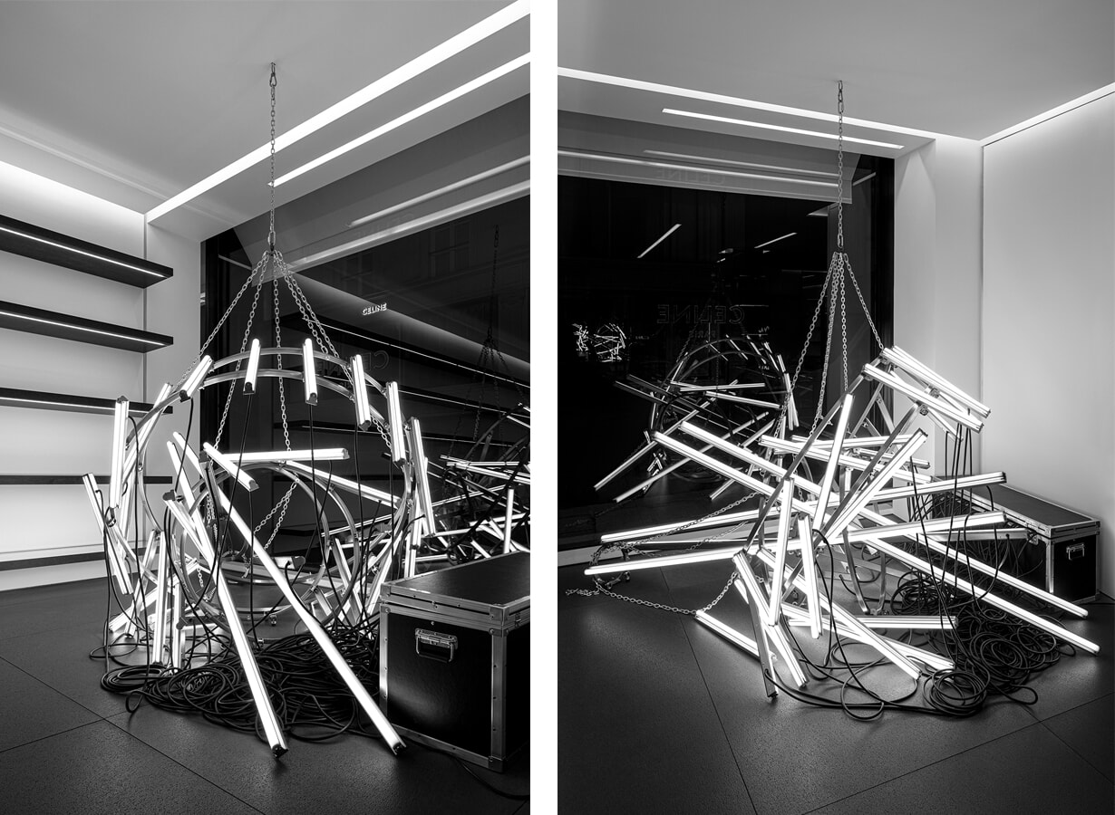 パリ、デュフォ通りの旗艦店に飾られている作品。各店舗のために作られたシャンデリアは、3つのシャンデリア構造で構成され、それがさまざまな崩壊状態で展示されている。このシークエンスの最初の作品は安定して吊り下げられた形であり、その後垂直、あるいは水平方向に次第に「崩壊」していく。作品はストップモーションのように、安定した状態から壊れた状態へ、華やかな形からだらしない形へ、立っている状態からつまづき、やがて隅でうなだれた状態になる。