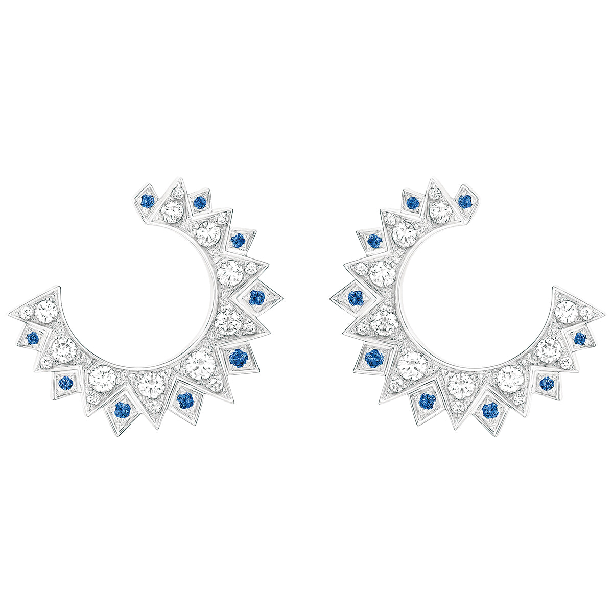 ホワイトゴールドの三角形にセットされたサファイアとダイヤは、太陽が昇る瞬間の輝きを再現。身に着ける人にポジティブなエネルギーを与える。イヤリング「サンライト」(WG×ブルーサファイア×ダイヤモンド)¥1,284,800/ピアジェ(ピアジェ コンタクトセンター)