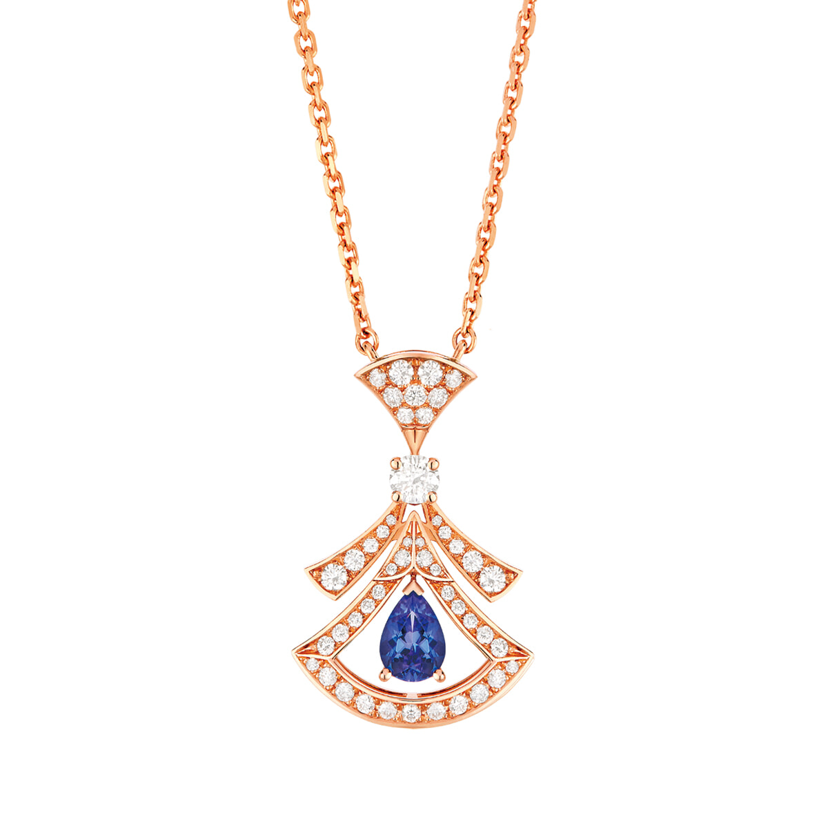 ダイヤで縁取られた、扇型のオープンワークの中央にあしらわれた、夜空の輝きが神秘的。創業地のローマに着想を得たコレクションの新作ネックレス。「ディーヴァ ドリーム」(PG×タンザナイト×ダイヤモンド)¥1,067,000/ブルガリ(ブルガリ ジャパン)