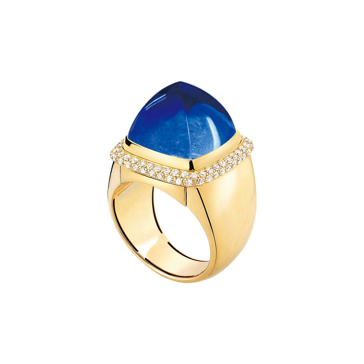 リヴィエラの太陽に煌めく数々の青が着想源。ラピスラズリとロッククリスタルが一体となったカボショントップは付け替え可。リング「パン ドゥ スークル」(YG×ラピスラズリ×ダイヤモンド)ストーン¥407,000、リング台¥1,122,000/フレッド(フレッド カスタマーサービス)