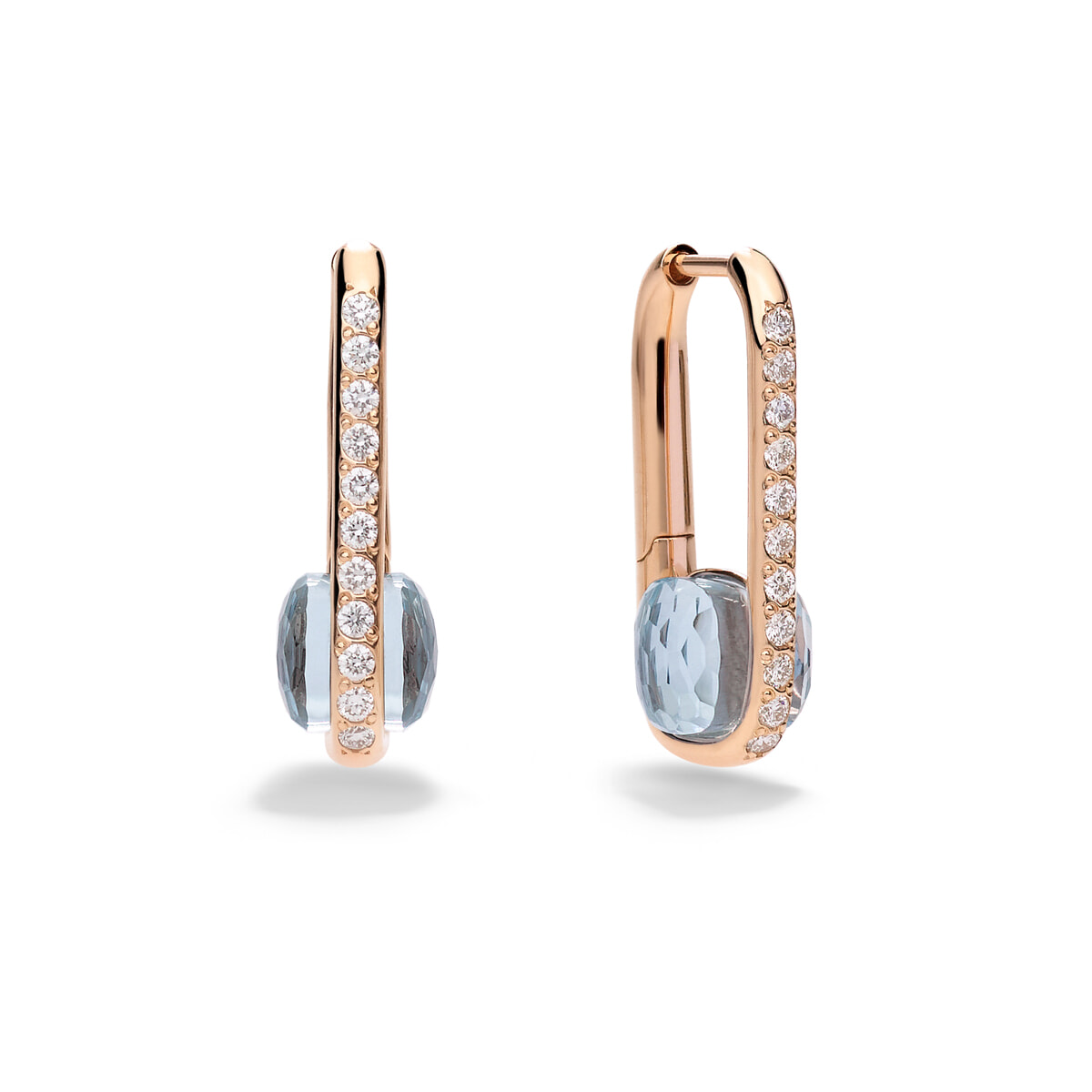 砂時計を意味するクレシドラカットを施したアクアマリンが、耳元でゴールドのブランコに揺れるような愛らしいデザインで誕生。イヤリング「イゾラ」(RG×アクアマリン×ダイヤモンド)¥1,650,000/ポメラート(ポメラート クライアントサービス)