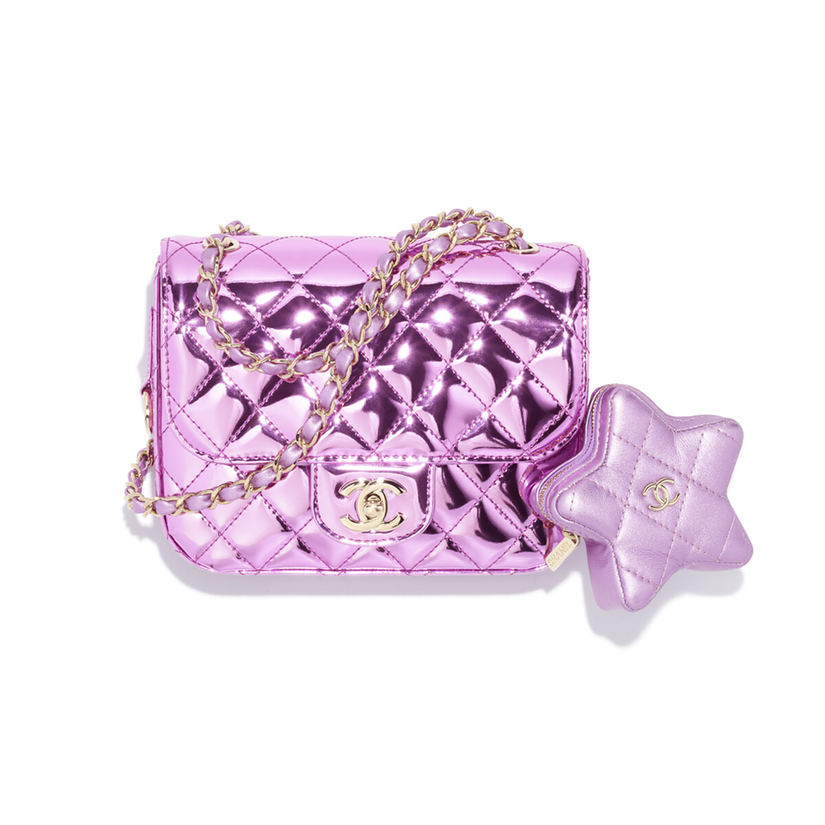 シャネルらしいキルティングバッグが、ディスコティックなピンクのメタリックを纏って登場。星型のミニポーチ付きでコーディネートにポップなムードを添える。