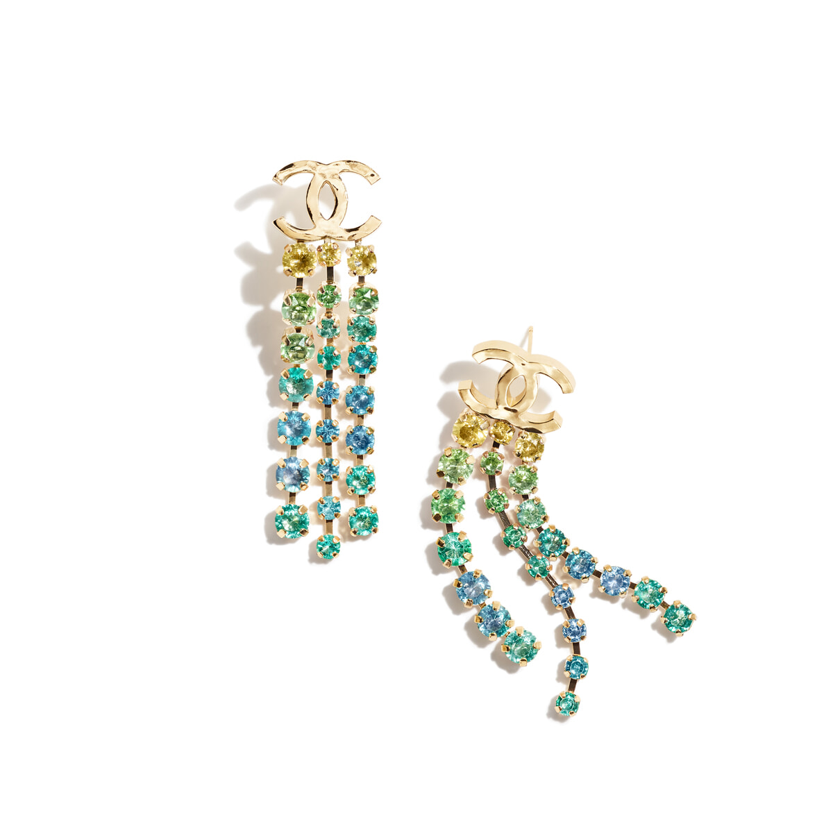 グラデーションカラーのクリスタルが輝くピアス。動くたびに軽やかに揺れる3連のラインストーンが顔まわりを華やかに彩る。