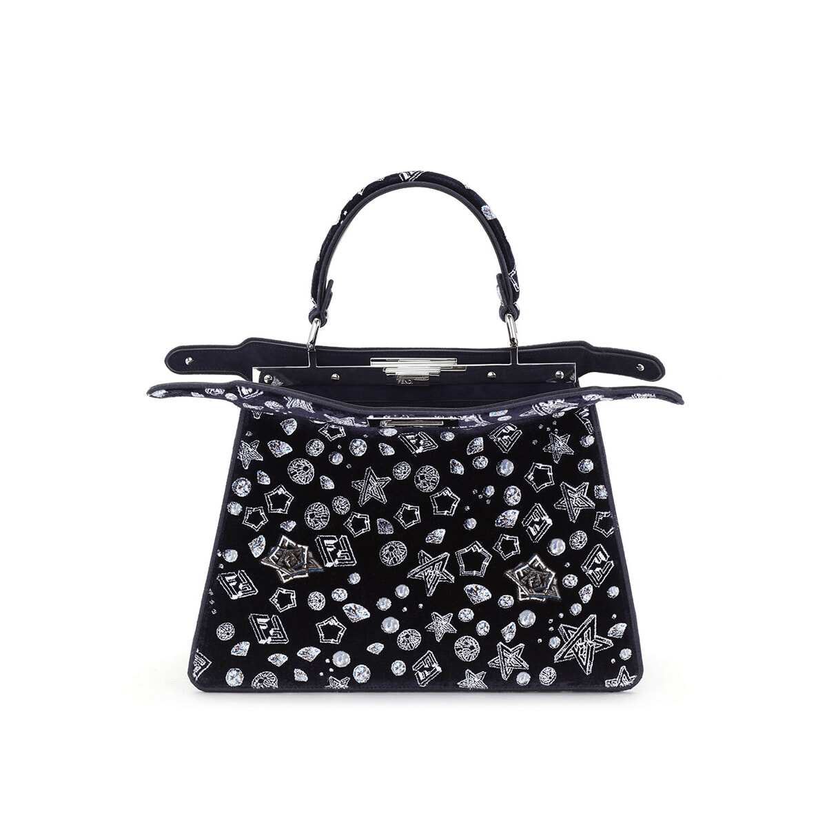 ミッドナイトブルーのファブリックに、立体的なクリスタルやパールで作られた「FF」モノグラム、そしてスターモチーフをあしらった「ピーカブー」は煌めく夜空のよう。持つ人の心を躍らせる特別な逸品。