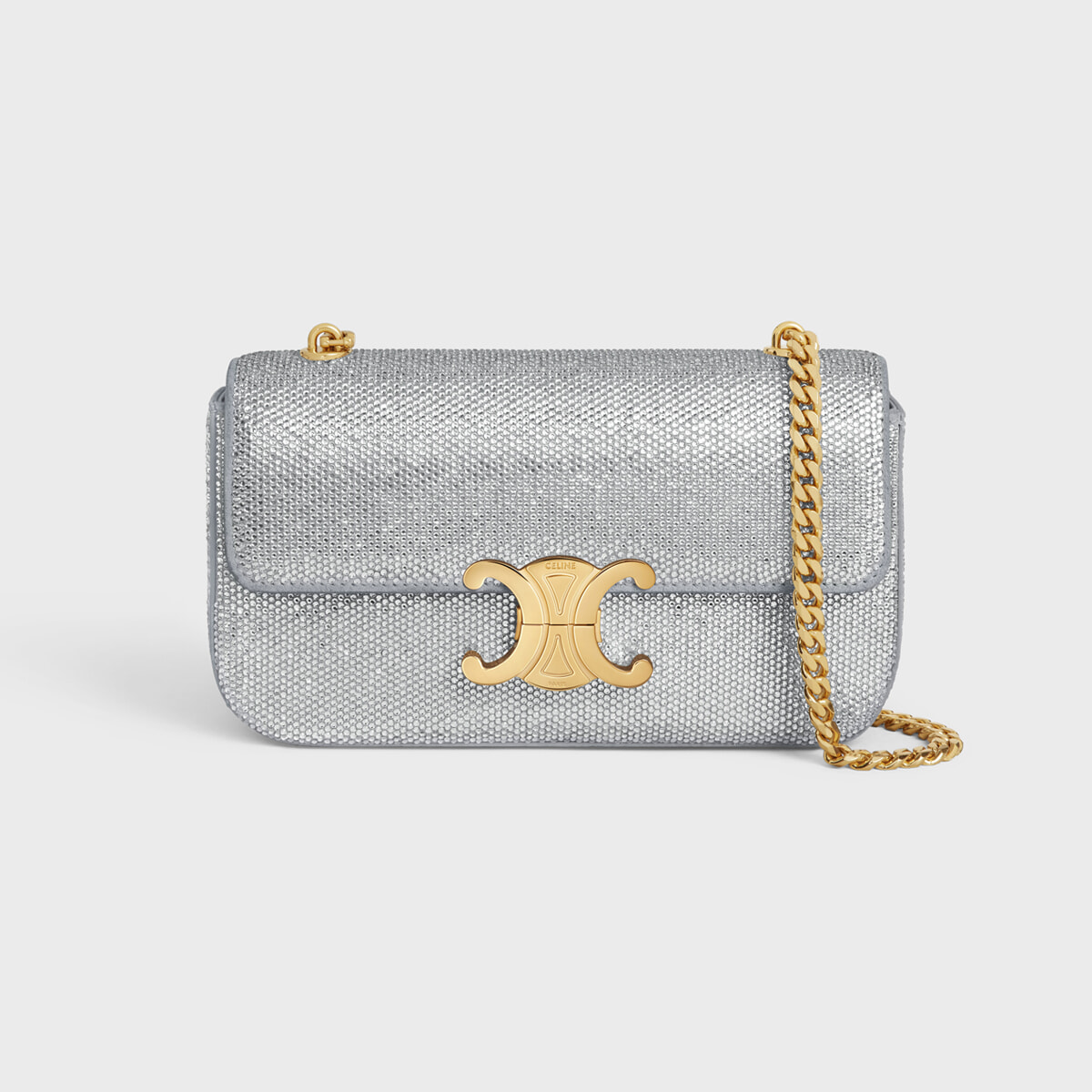 2018年にエディ・スリマンがセリーヌのロゴを再解釈し発表して以来、人気を博す「トリオンフ」も全面に輝きを纏って。クリアなシルバーのクリスタルとゴールドのバックル&チェーンのバイカラーがゴージャス。
