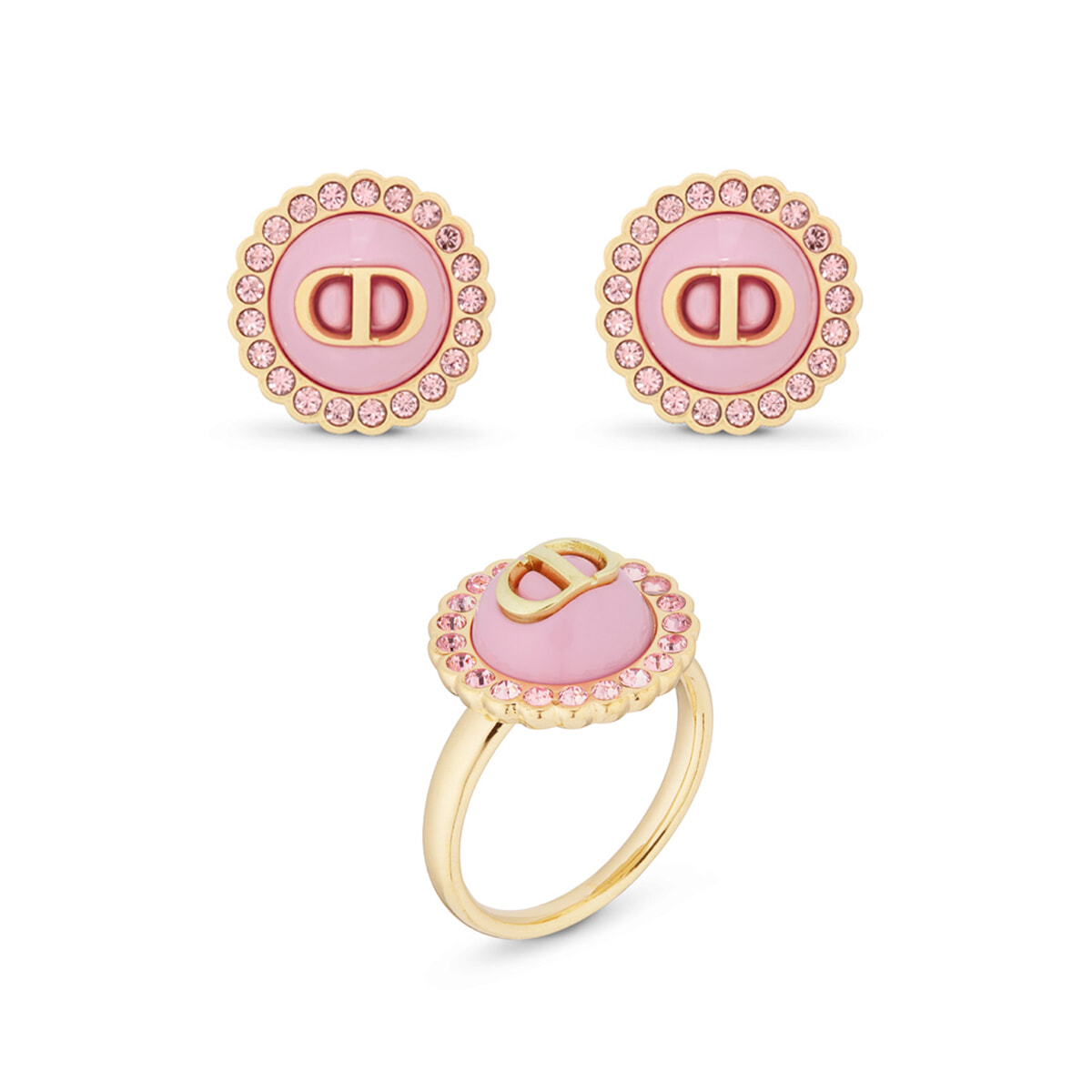 ライトピンクのガラスカボションと周囲に配置されたクリスタル、そしてゴールドメタルのロマンティックな化学反応が魅力。「プチ CD バロック」のスタッドピアスとリングはセットでコーディネートしたい。