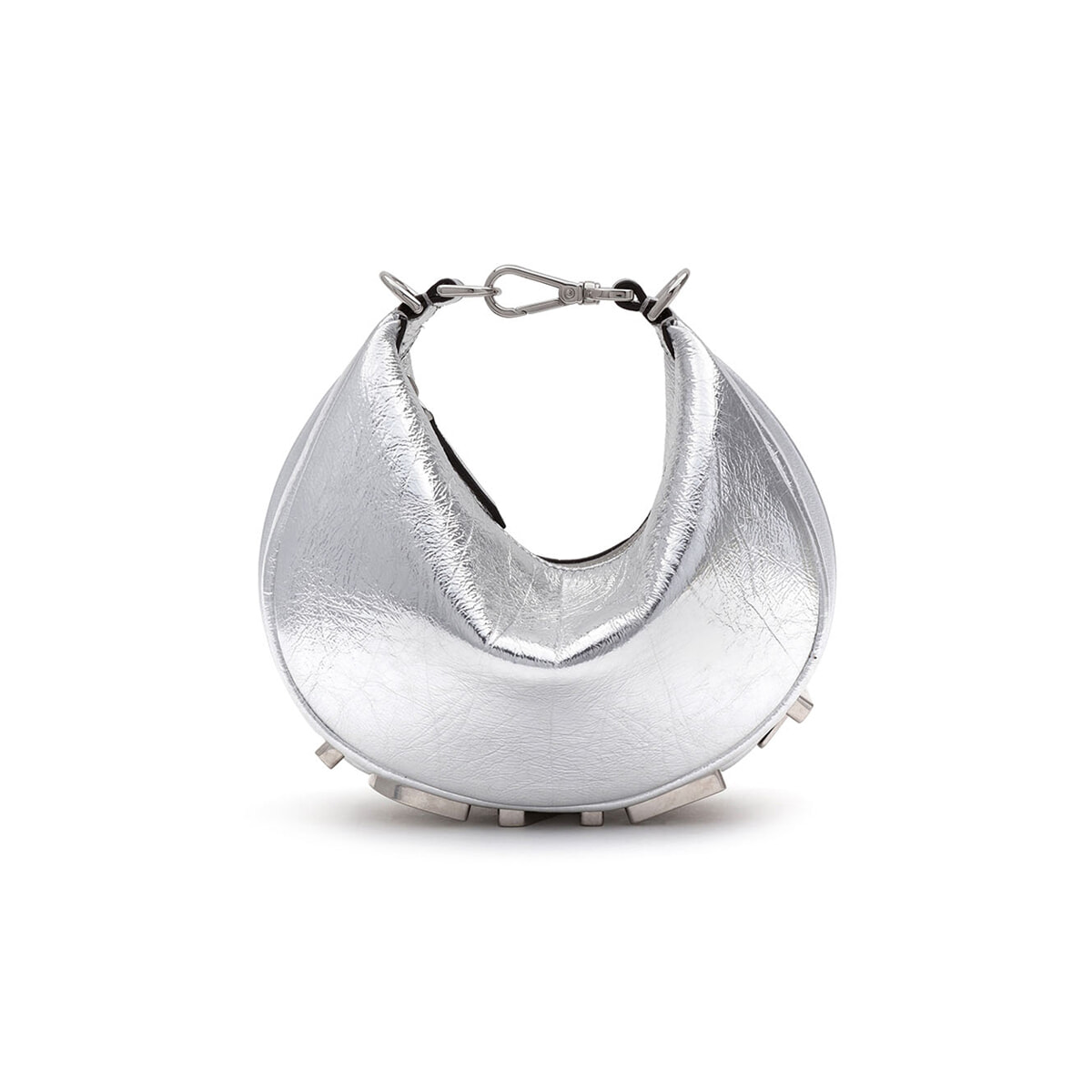 バッグの底にインパクト大なFENDIのロゴが現れる「フェンディグラフィ」に幅20cmのミニサイズが登場! シルバーのラミネートレザーを全面に配したフューチャリスティックな佇まいが素敵。ショルダーストラップ用のフック付きで機能性も抜群。