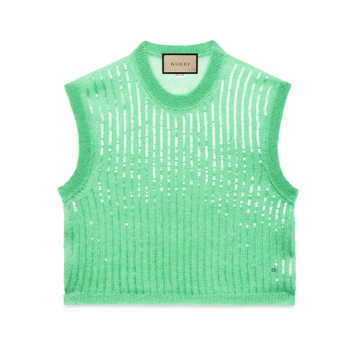 グリーンのモヘアニットにストライプ状のシークインをオン。レイヤードスタイルが楽しめるショート丈のベストは、こんなさりげなく輝く一着を選びたい。左下にさりげなくインターロッキングGのあしらいも。