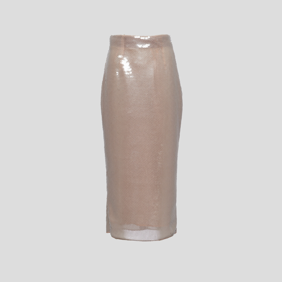 マーメイド気分で履きたい総スパンコールのハイウエストペンシルスカート。パールグレーのシックな輝きと透け感のある素材も旬なムードを放ち、センシュアルなスタイルが完成する。