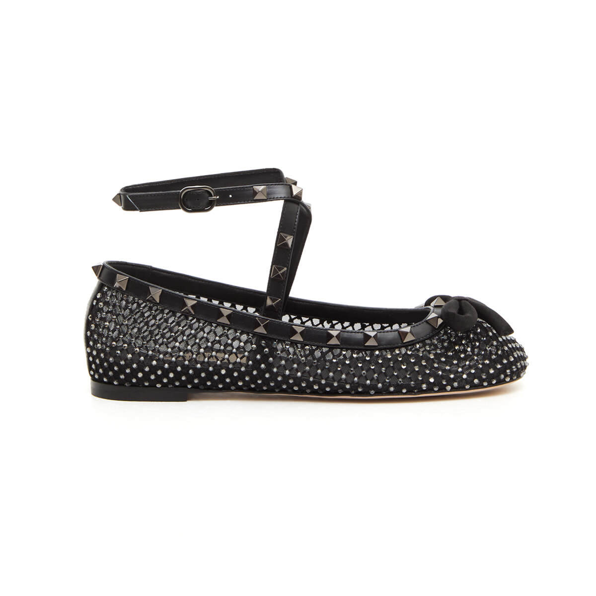 ヴァレンティノの人気バレリーナシューズ「ロックスタッズ」にもクリスタルを配した新作が登場。ゴシックな雰囲気がスタイリングの新しい扉を開いてくれる。アンクルストラップ付きで履き心地も抜群。