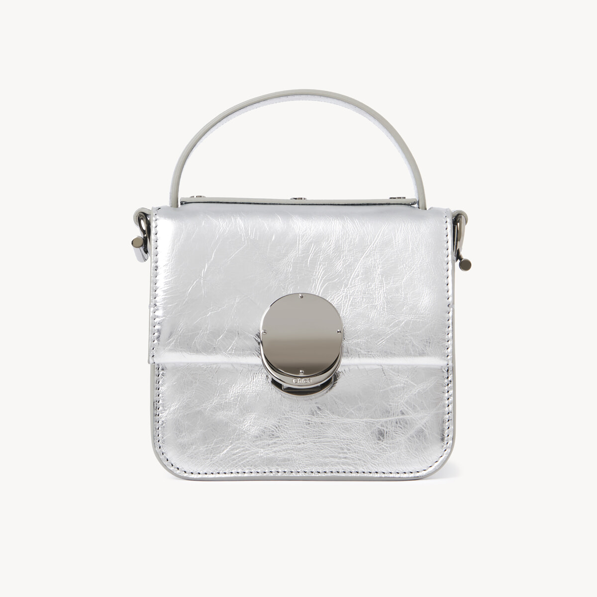 コインクロージャーが目印の「ペネロペ」にメタライズドカーフスキンボディが仲間入り。ダイナミックなシルバーカラーも、サークル型とボックス型を掛け合わせたフォルムを活かしたデザインならアーティスティックな印象に。