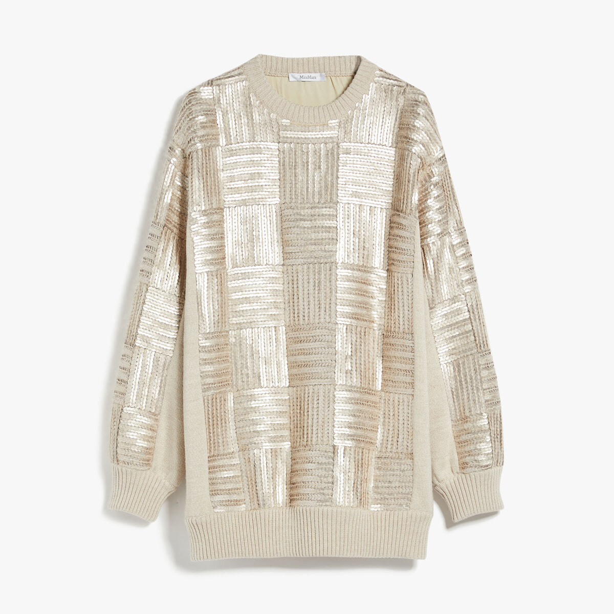 シークインの配列でチェッカーを描いたオーバーサイズのミニ丈ドレス。マチュアなシャンパンカラーとスポーティなディテールのバランスが程よく、一枚でドレスアップもカジュアルダウンも叶う。