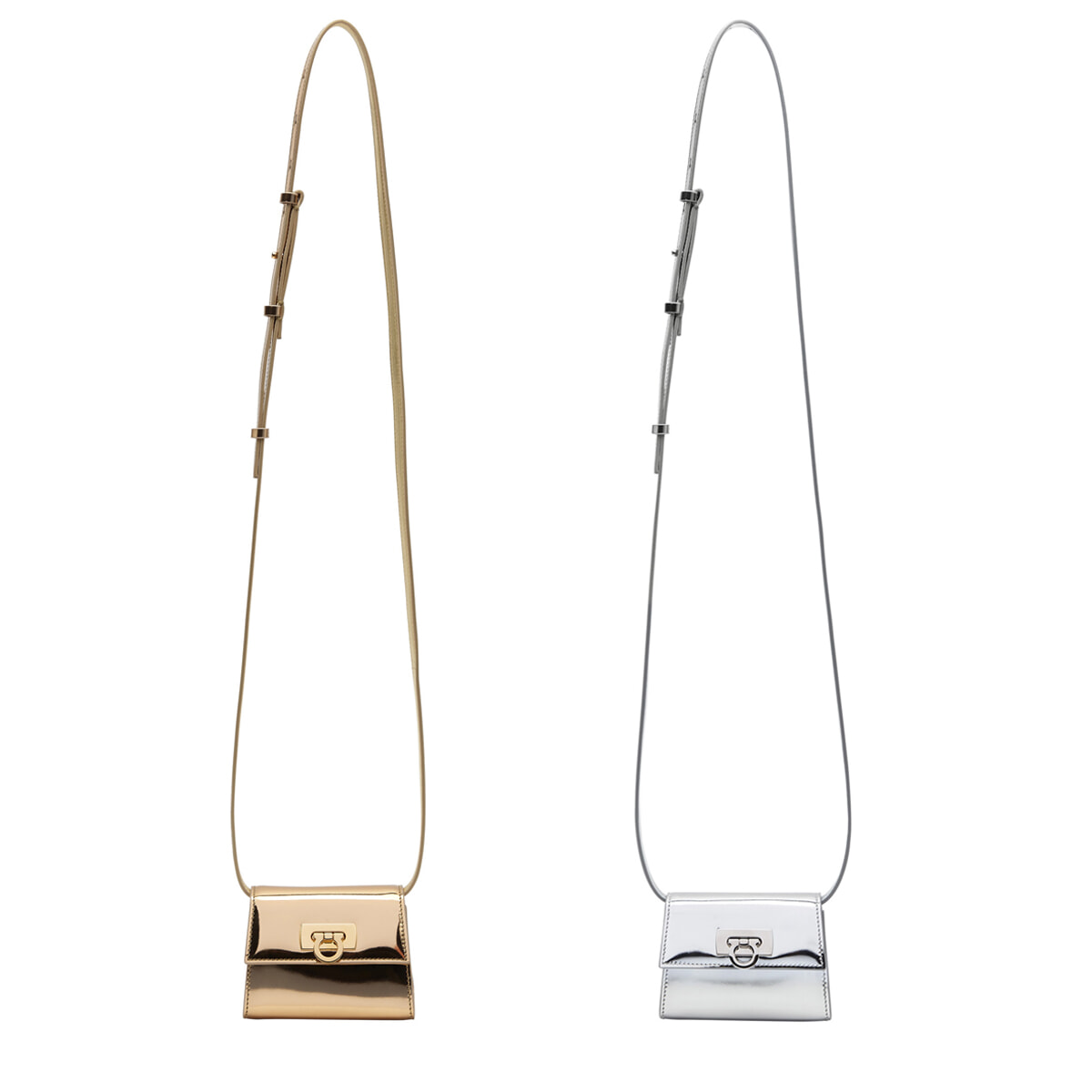 スーパーミニサイズが可愛らしいストラップ付きカードケース。ミラー加工したカーフ素材が美しく輝き、アクセサリーのように身につけたくなるアイテム。ミニサイズのガンチーニがアクセント。