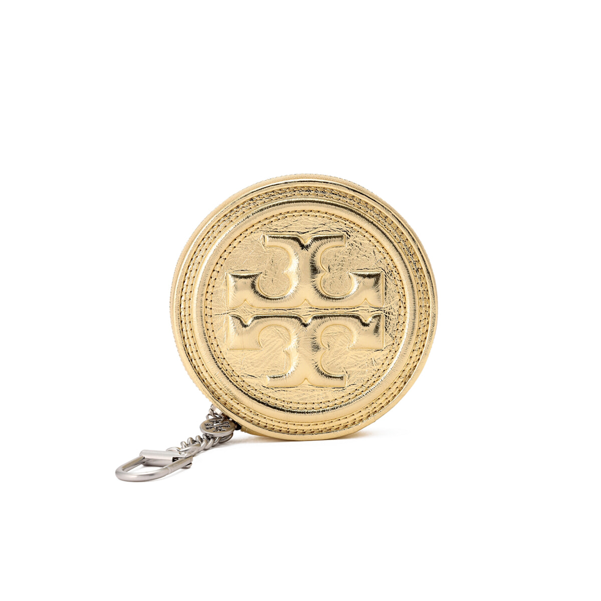 ゴールドのメタリックレザーに「ボンベ ダブルT」ロゴをあしらった、コイン型ポーチ。ハンドバッグやベルトループなど、どんな場所にも取り付けられるので毎日のお供に。