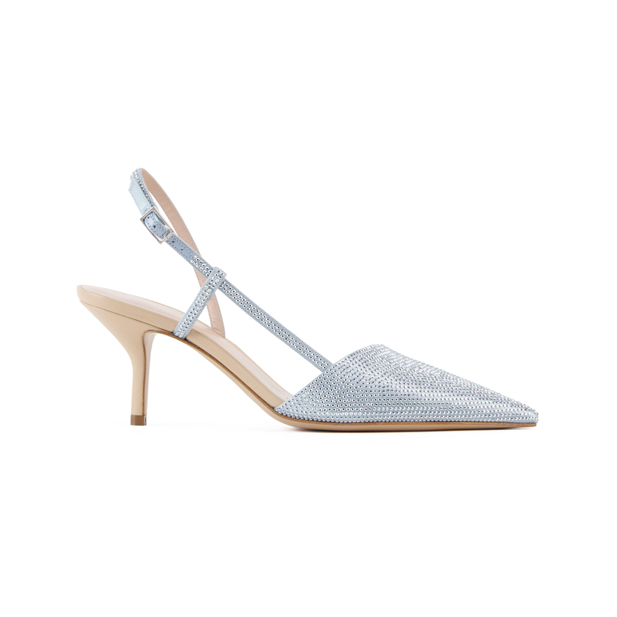 旅先でのドレスアップやパーティスタイルの足元をレベルアップさせるマスターピース。繊細なラインストーンと柔らかいライトブルーの配色にフェミニニティが宿る一足。