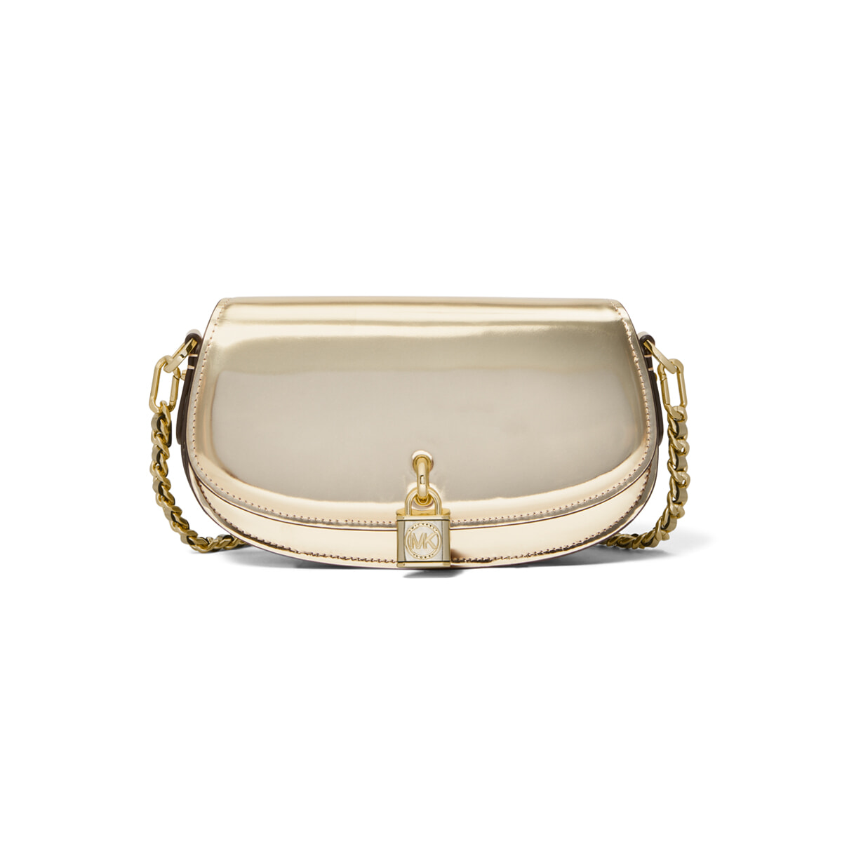 MKロゴのパドロックチャームがポイント。大人好みの淡いペールゴールドが目を引く、「ミラ」メタリックショルダーバッグ。光沢仕上げのメタリックレザーが滑らかで上品さが際立つ。