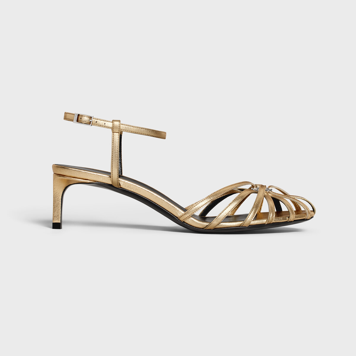 ゴールドの輝きと繊細なストラップで美しいフォルムを実現したサンダルは、20年代のアールデコデザインを想起させるエレガントな一足。トゥの中央にはセリーヌのトリオンフのあしらいも。