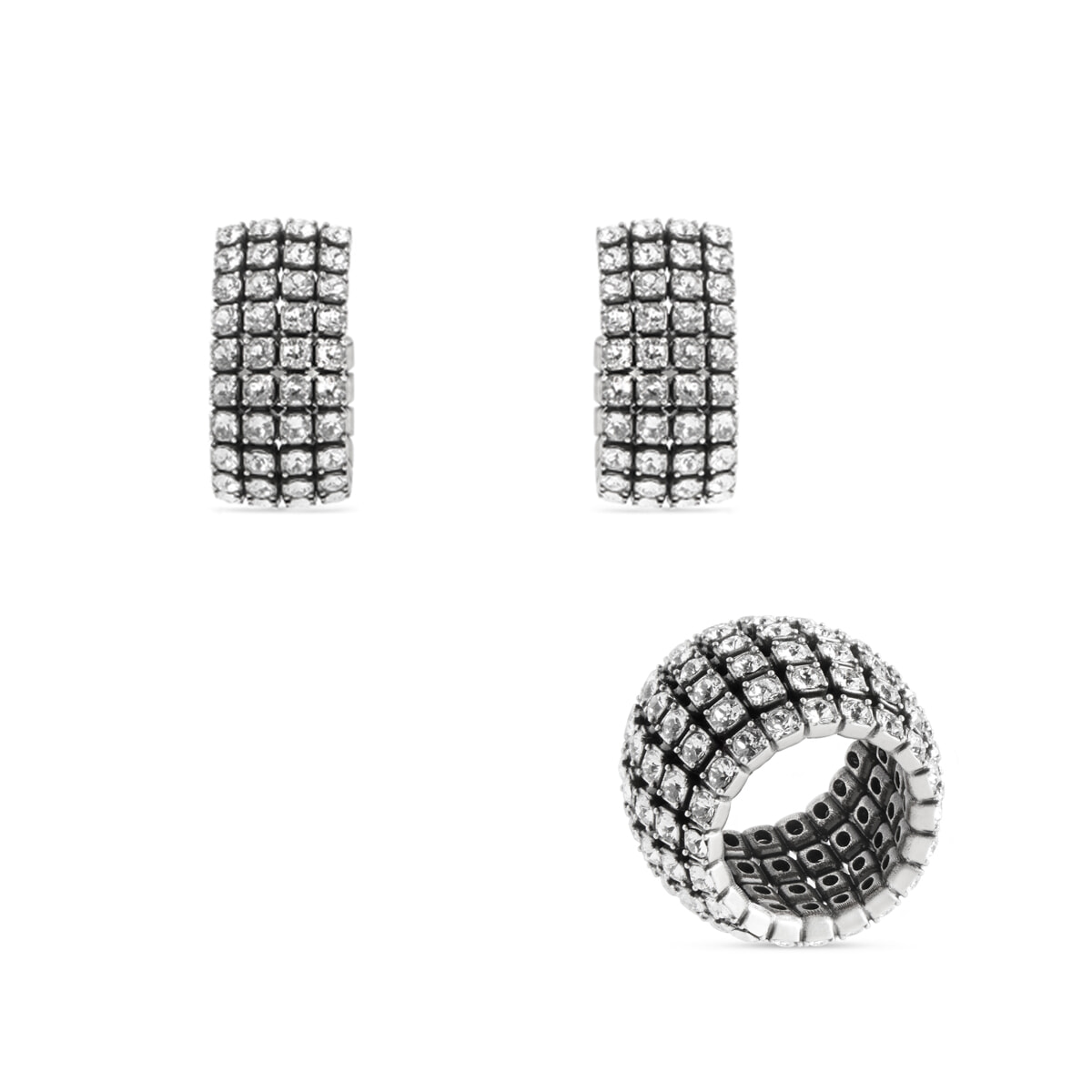 アンティークシルバーが目を引く、グラムなイヤーカフとリング。ボリューム感のあるアイテムで、光を反射するクリスタルが顔まわりや手元をゴージャスに煌めかせる。