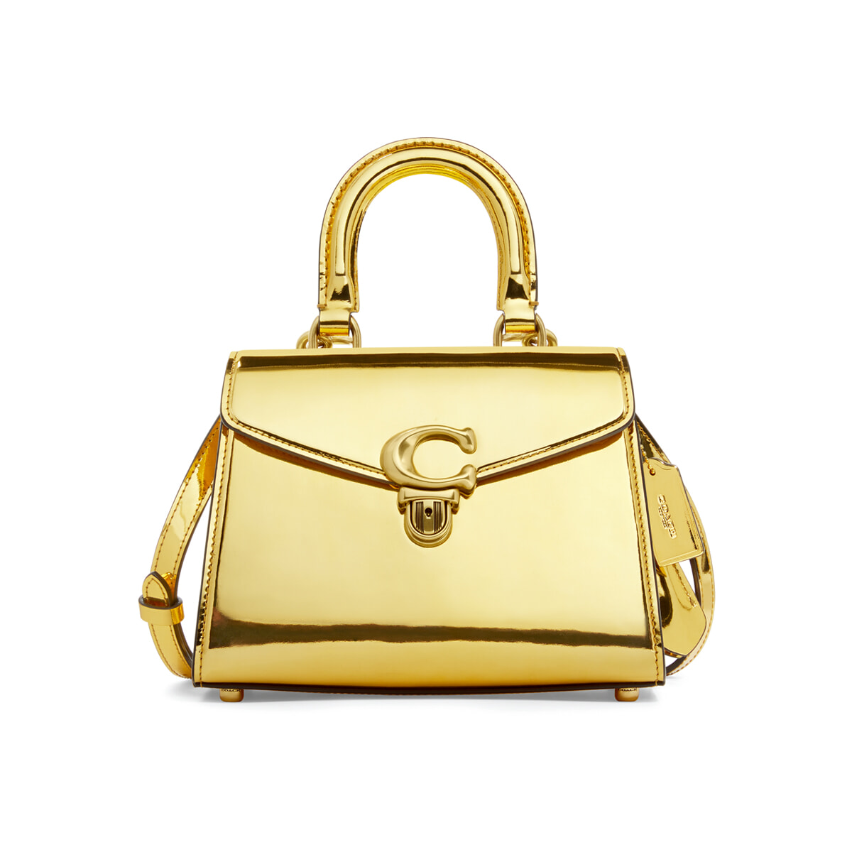 コーチの「サミー」オリジナルよりもひと回り小ぶりなサイズながら、トップハンドルまでメタリックゴールド一色に染まってパワフルに。デイリーなお出かけ時にも華やぎをプラスしてくれる。