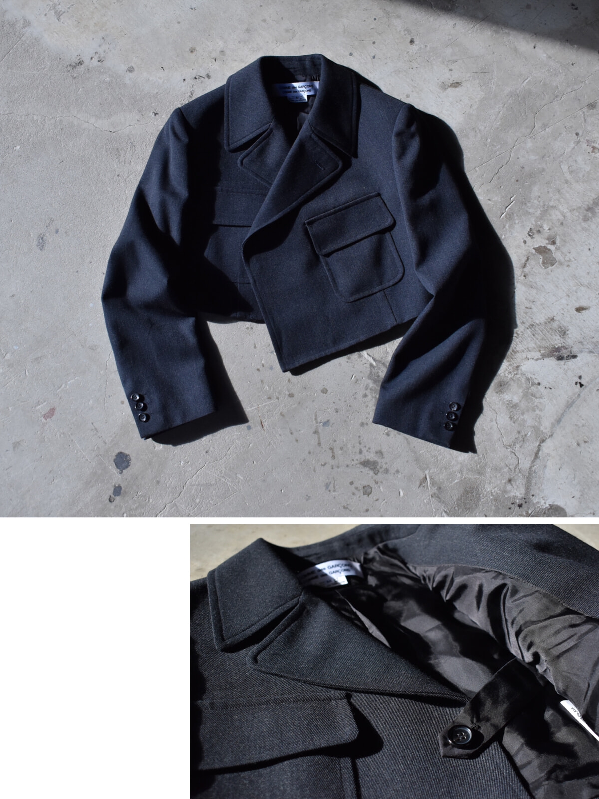 「コムコム」の愛称で親しまれているコム デ ギャルソン・コム デ ギャルソンが集まる一角では、制服を思わせるようなシャツやプリーツスカートが並び、ノスタルジアを感じるラインナップに胸が高鳴ります。購入したのはクロップト丈のジャケットなのですが、アシメトリーのシルエットがどんな状況でも決まる裏ボタンつき。仕立てのよい服は、どこから見ても美しいのだと、服が持つ力を感じる一着です。