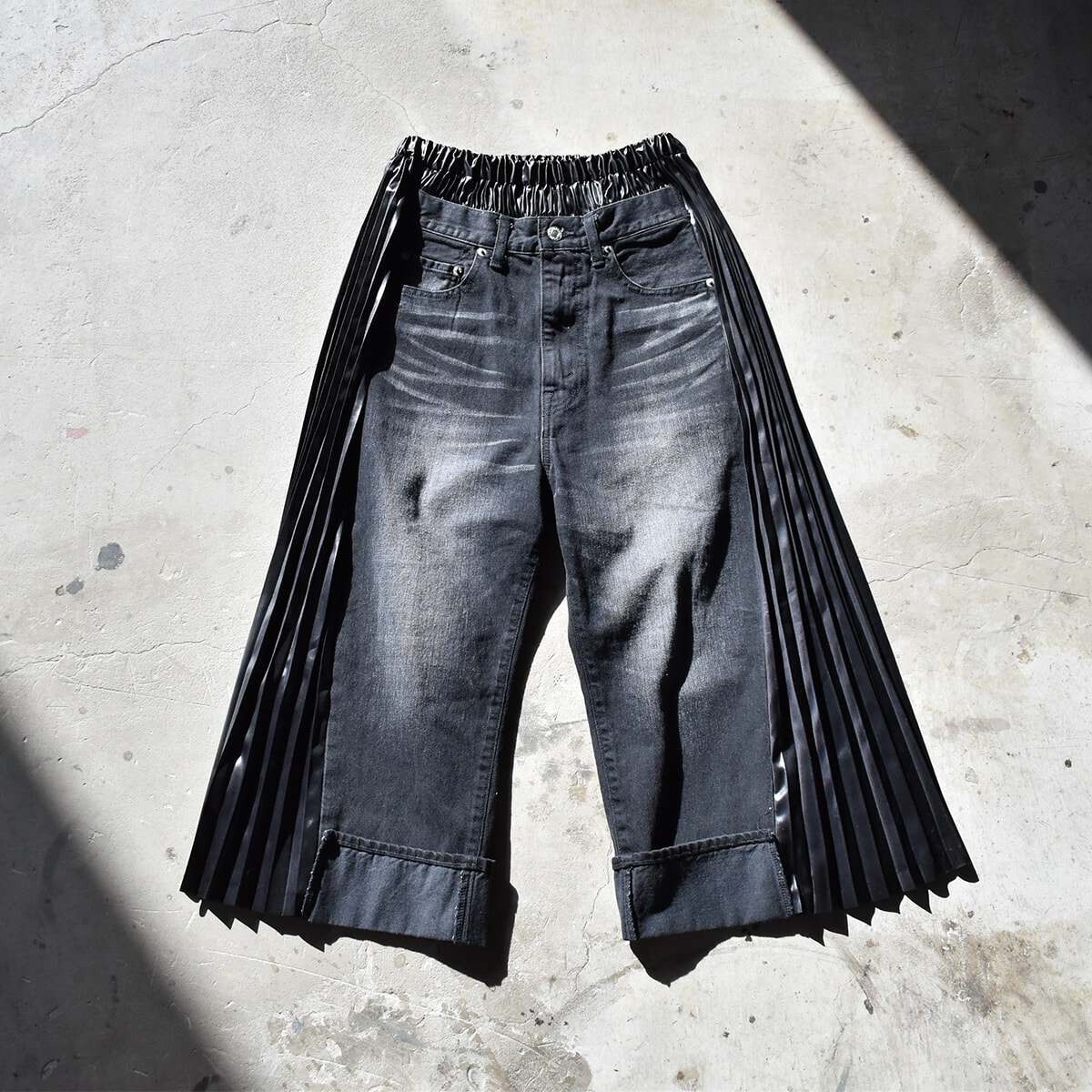 だんだんとリミッターが外れはじめた私が出合ったのはジュンヤ ワタナベのデニムパンツ。リーバイス®のブラックデニムに光沢のある素材のブラックプリーツを融合させた、エッジの効いた一着です。普段はこういう攻めたデザインのものは手を出せないでいるのですが、思わず出ていた言葉は「試着室、行ってきます!」。ウエストがゴムになっているので着心地も最高です。