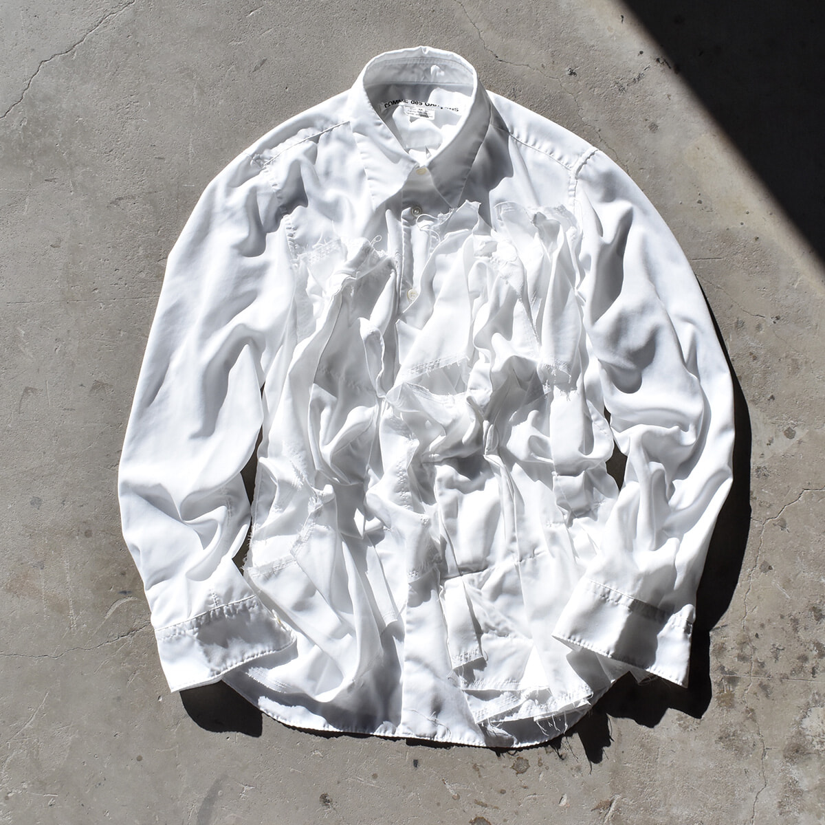 今回の買い物のナビゲーターである先輩に導かれるまま店内を回遊。まず手にとったのは、コム デ ギャルソンのホワイトシャツ。端正なホワイトシャツにボリュームのあるフリルがあしらわれた一枚は、てろっとした滑らかな素材のおかげで仰々しくなりすぎない。モードなバランスが緻密に計算されています。
