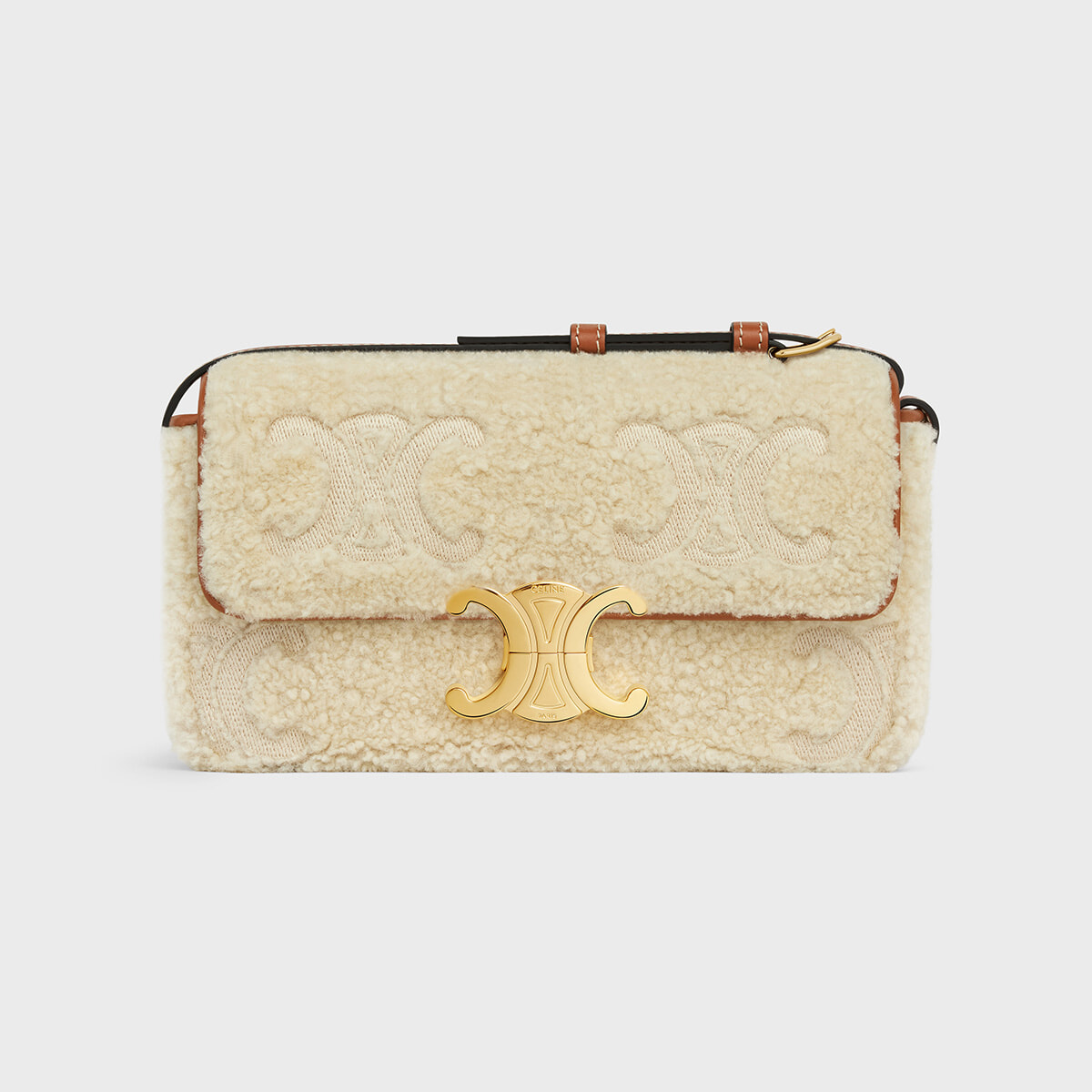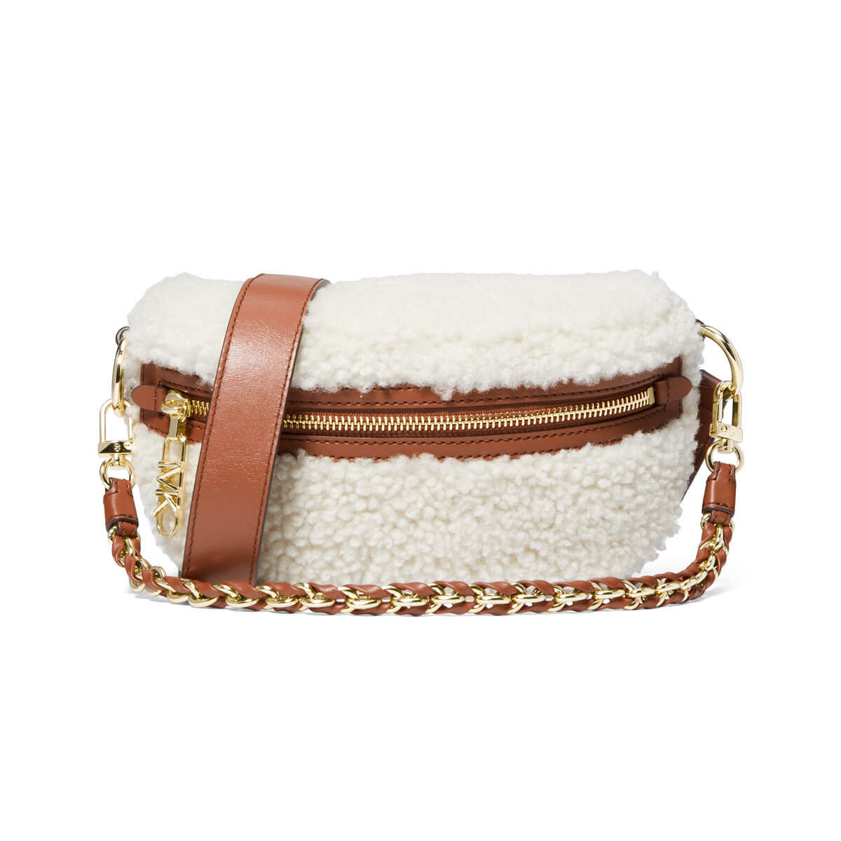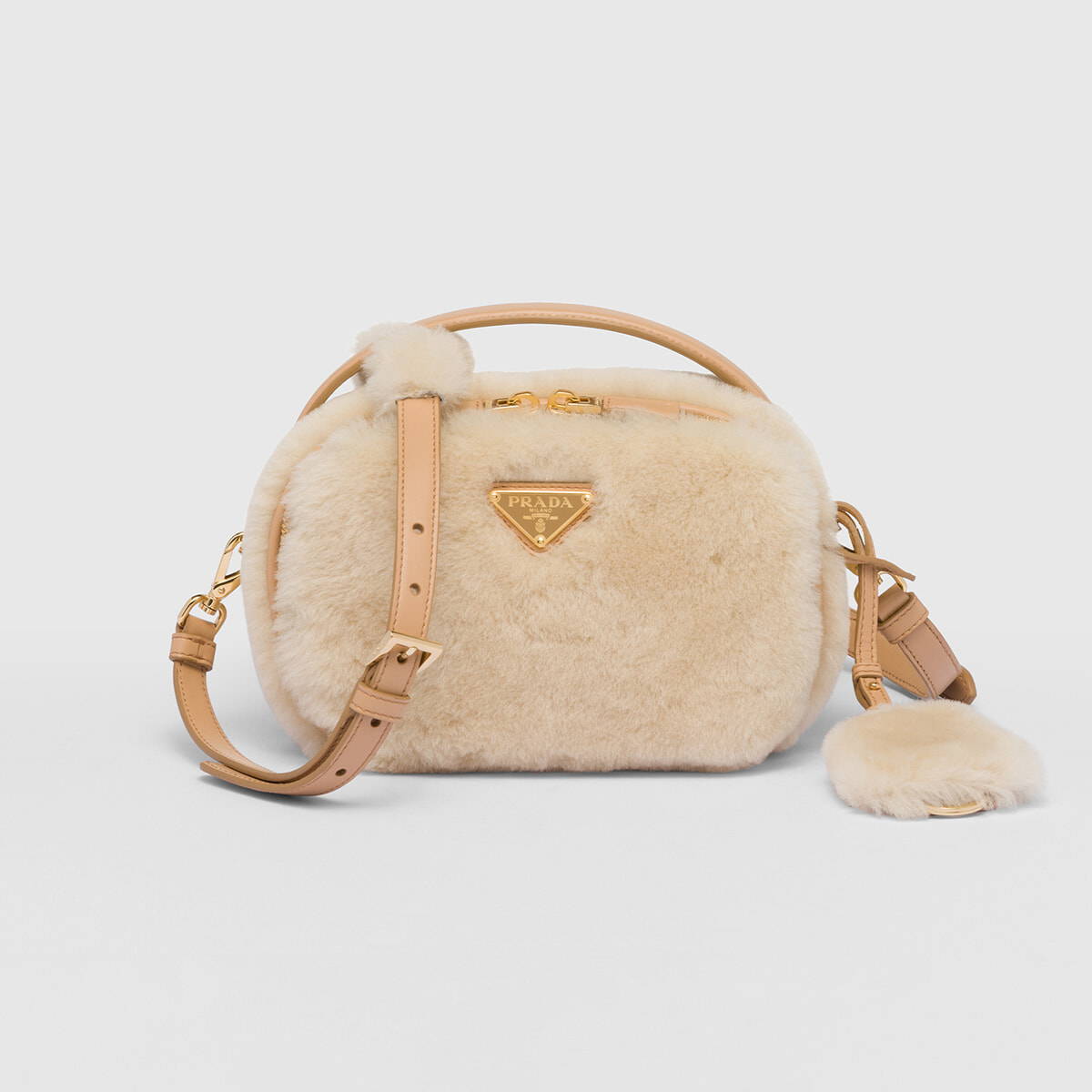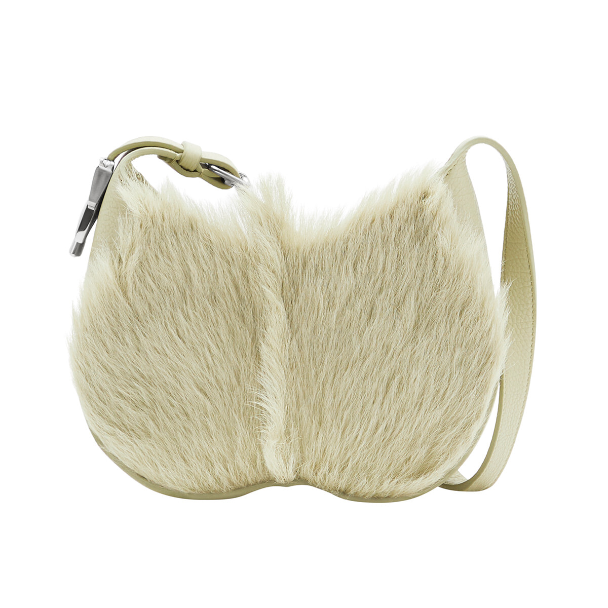 ころんとしたフォルムとライトベージュカラーのシアリングが可愛らしい新作。ショルダーストラップや取り外し可能なキーリングにもシアリングが施され、冬らしいムードを加速する。横幅19cmのミニサイズ。